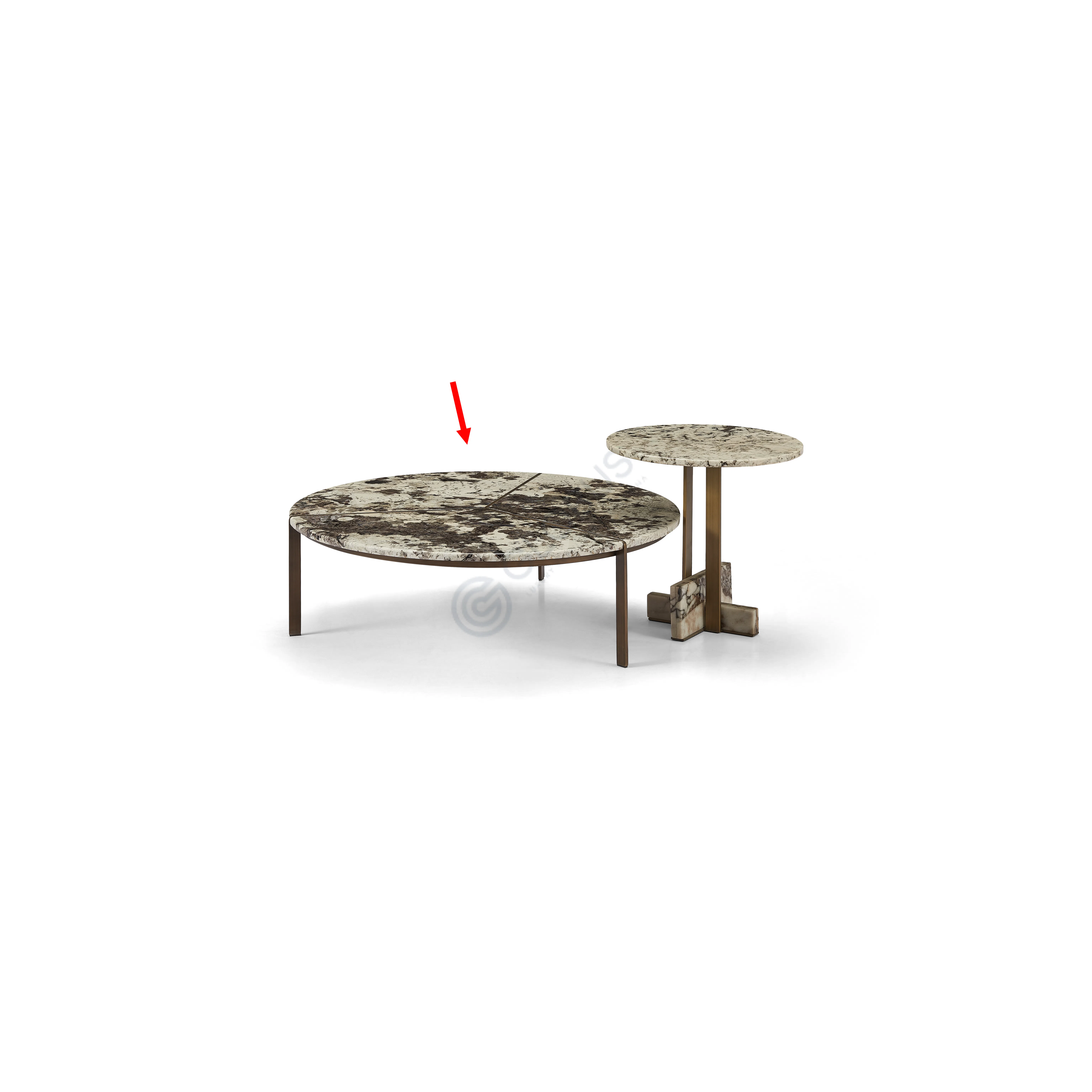 Столешница выполнена из мрамора с тонкими прожилками тёмного оттенка, который органично сочетается с тёплым золотисто-бронзовым металлом опоры. Геометрия основания, где две металлические пластины перекрещиваются под столешницей, придаёт изделию характерную структурность.