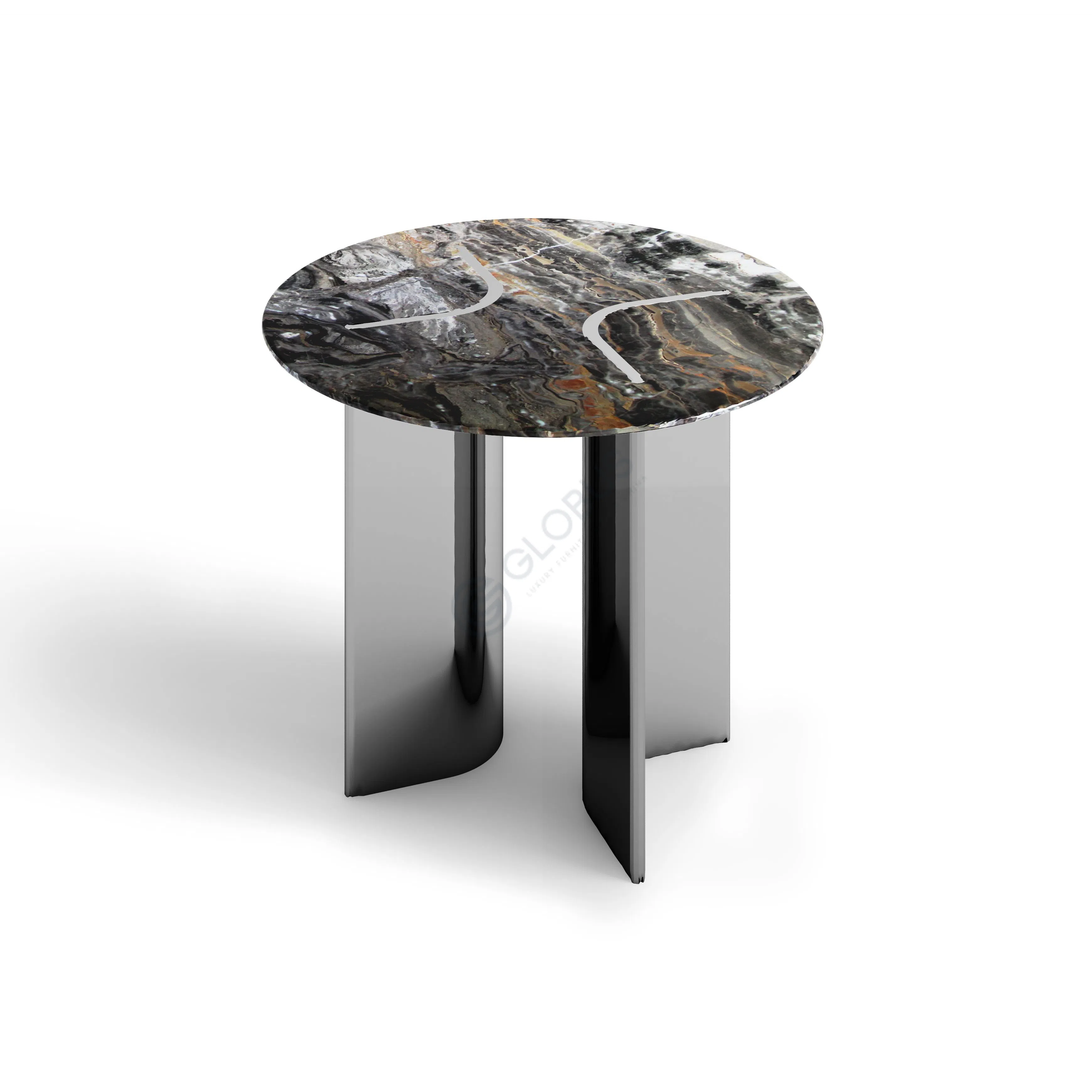 Этот журнальный столик представляет собой подлинное произведение интерьерного искусства. Его столешница создана из натурального мрамора, чья поверхность демонстрирует уникальный и неповторимый природный узор. Вихри глубоких оттенков в сочетании со светлыми прожилками формируют захватывающую визуальную палитру, превращая каждый экземпляр в особенный элемент.
