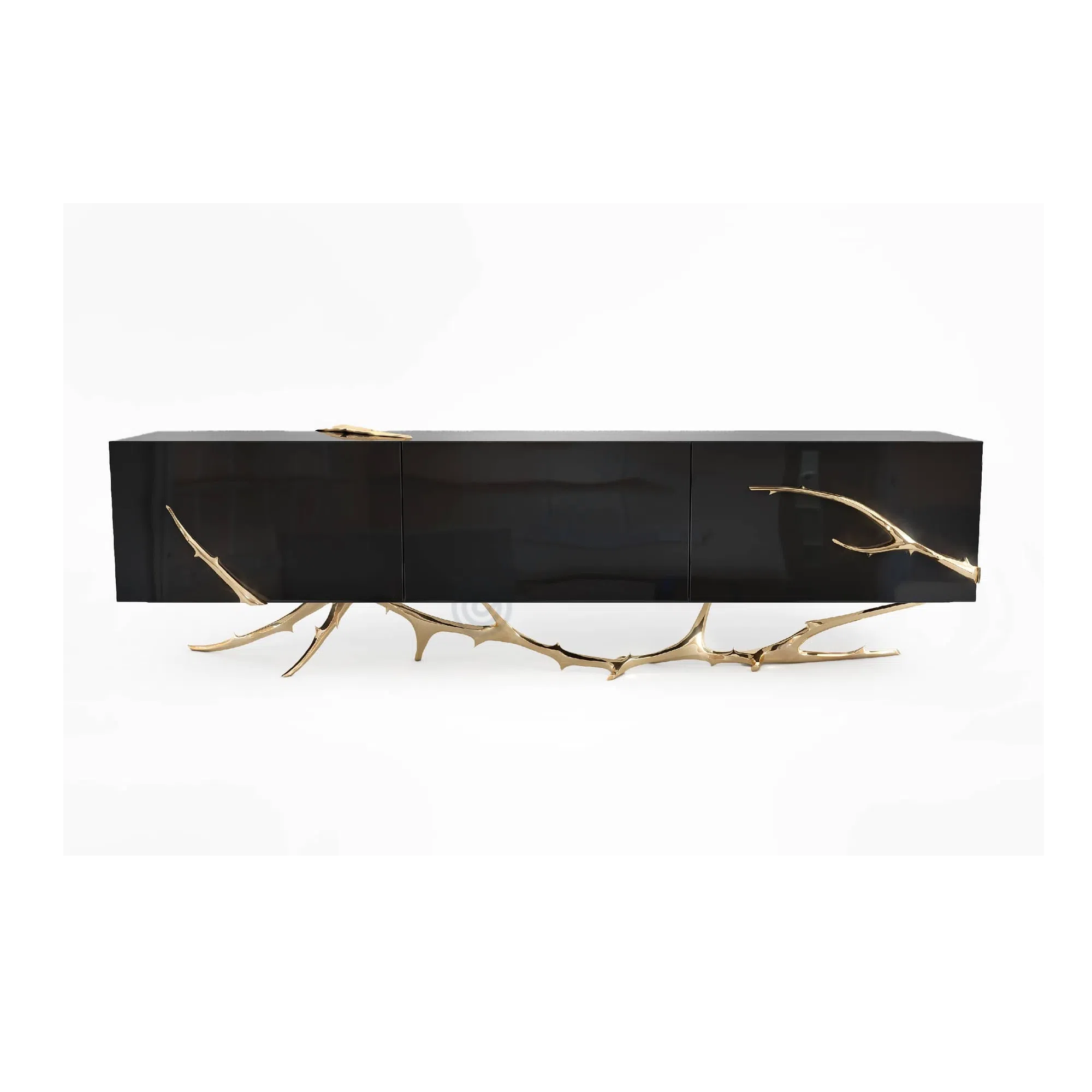 Особое внимание привлекает основание и ручки, отлитые из благородной латуни. Их форма напоминает причудливые ветви или кораллы, придавая буфету уникальный, художественный характер. Этот органический мотив эффектно контрастирует с прямолинейными формами корпуса, создавая динамичный и запоминающийся образ.