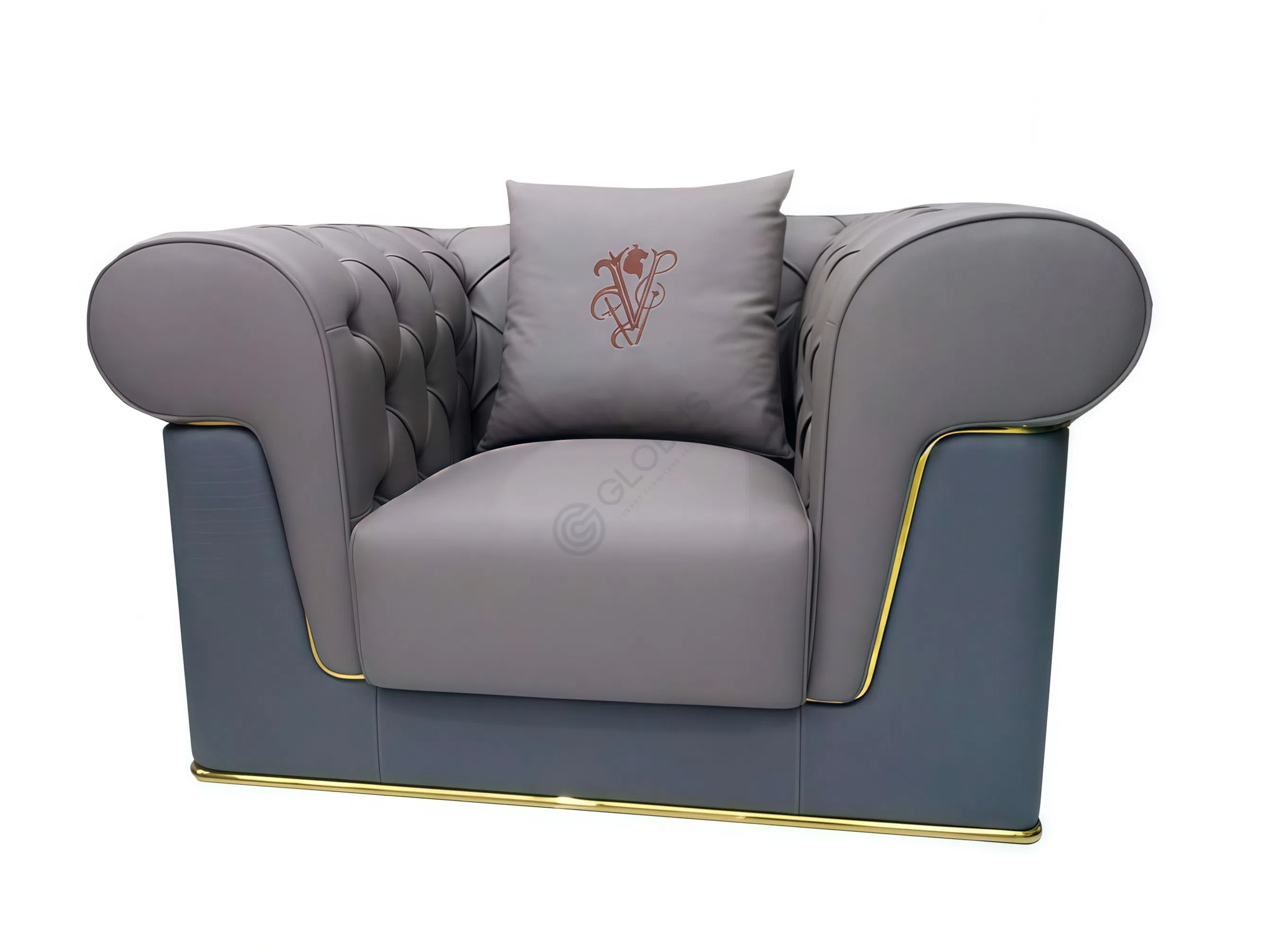 Каждая деталь этого предмета мебели говорит о безупречном внимании к качеству. Обволакивающая обивка, выполненная из высококачественной кожи Наппа или изысканной экокожи на микрофибре, приглашает к расслаблению и придает пространству особую текстурную глубину. Элегантная каретная стяжка на спинке и боковинах подчеркивает объем и придает изделию классическую респектабельность. Основа конструкции опирается на прочный каркас из натурального дерева и фанеры, гарантирующий долговечность, а неуловимые акценты из полированной нержавеющей стали интегрированы в основание, придавая модели современное звучание и легкую изысканность.