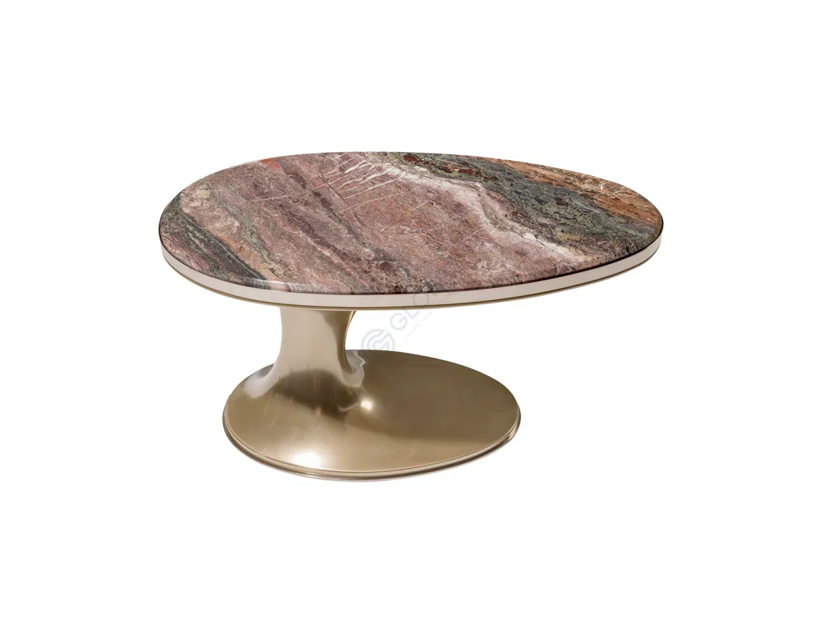 Этот изысканный предмет интерьера обладает уникальным силуэтом, притягивающим взгляд. Его круглая столешница выполнена из великолепного натурального камня, демонстрирующего неповторимые природные узоры и богатую фактуру. Поверхность кажется живой, хранящей в себе историю тысячелетий, застывшую в камне.
