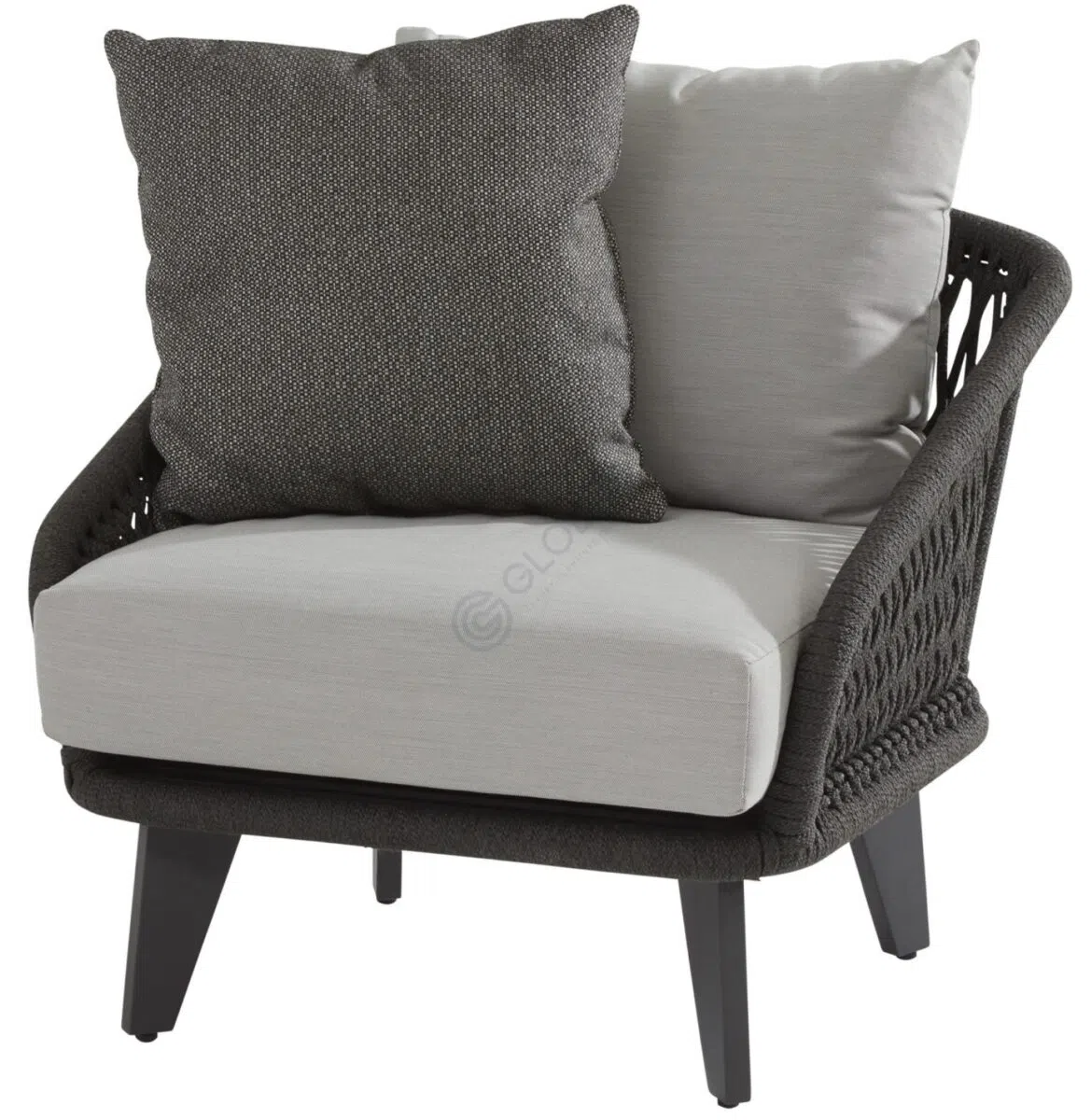 Конструкция изделия сочетает в себе легкость и прочность алюминиевого каркаса с изысканным плетением из веревки, формирующим боковые части и спинку. Светлые текстильные подушки мягко контрастируют с темным основанием, создавая привлекательный визуальный акцент и обеспечивая высокий уровень комфорта.