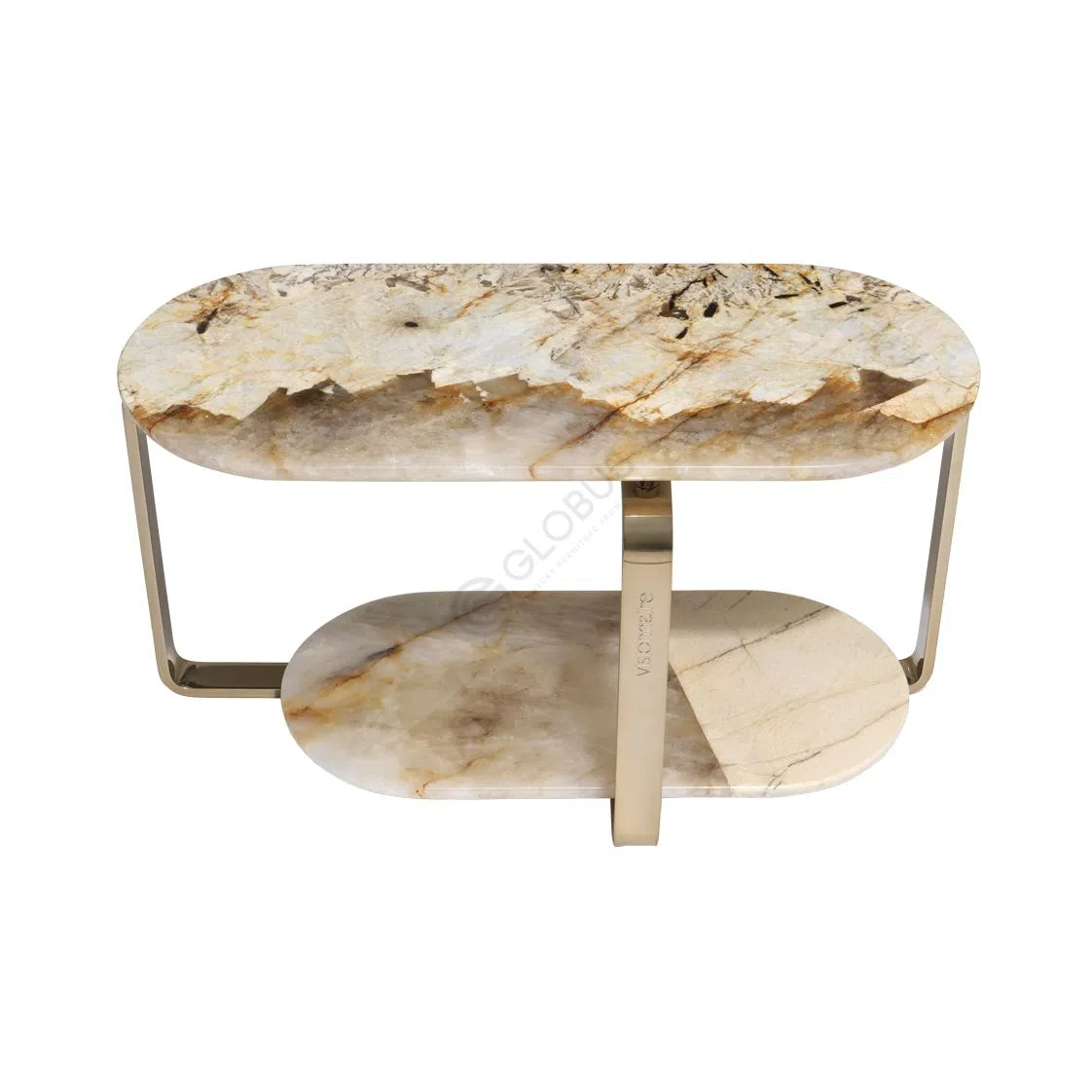 Каркас выполнен из нержавеющей стали с зеркальной полировкой теплого оттенка. Овальная столешница и нижняя полка изготовлены из натурального мрамора, каждая поверхность обладает уникальным рисунком и мягкой цветовой палитрой.