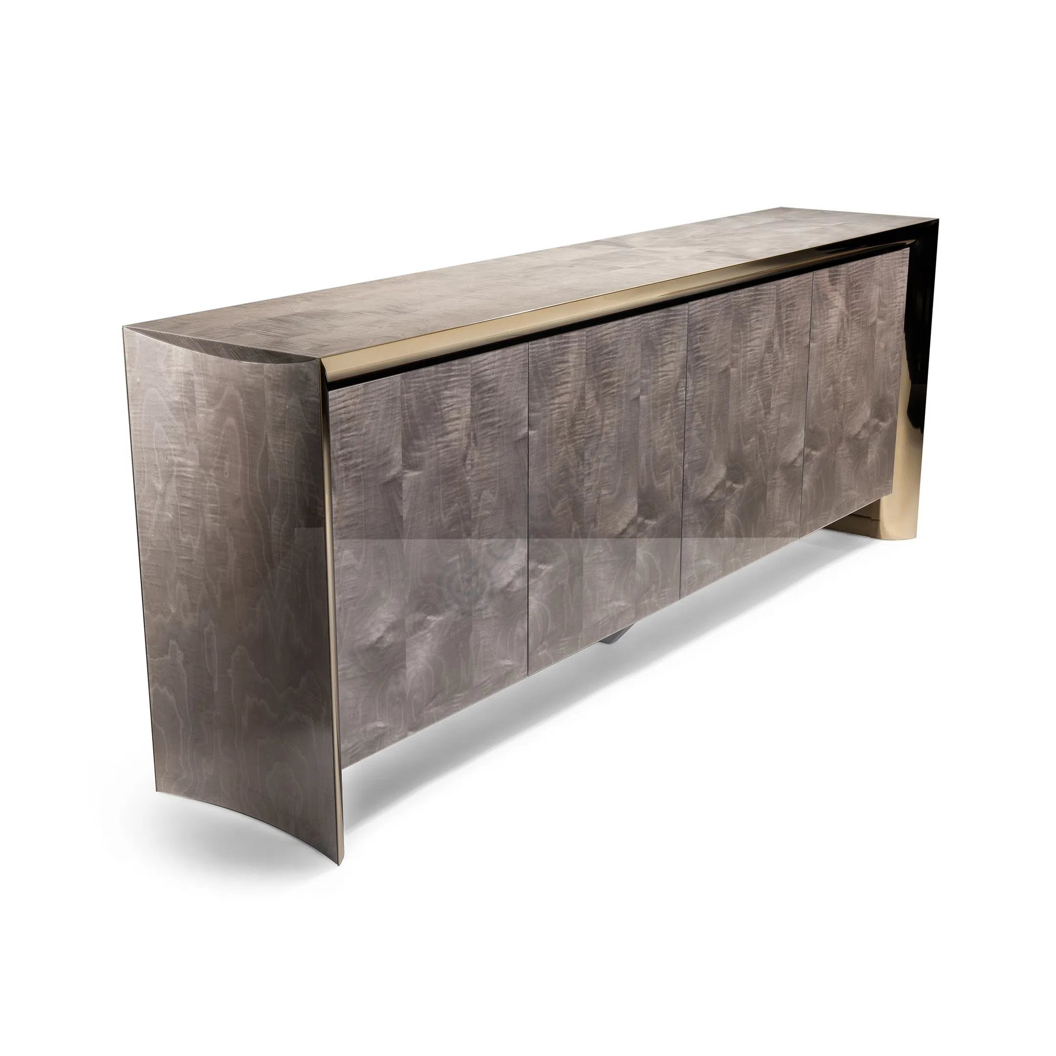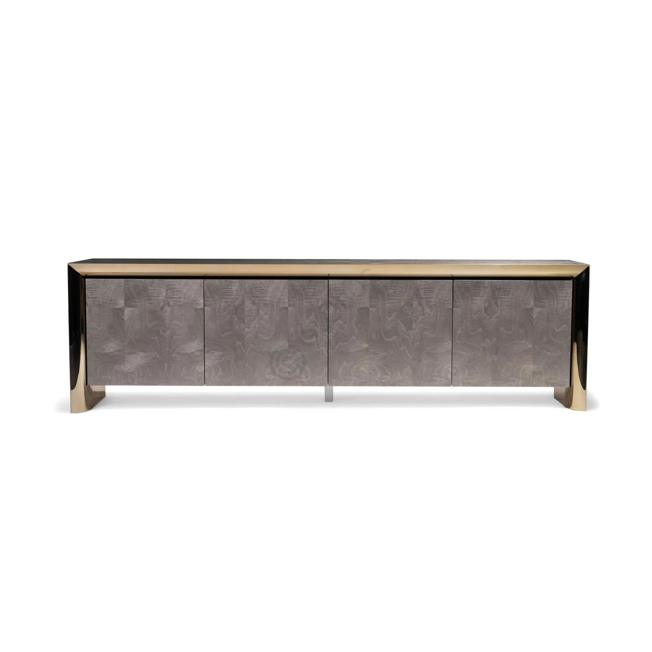 Глянцевая поверхность фасадов создает ощущение глубины и роскоши, отражая свет и визуально расширяя пространство. Плавные линии боковых опор из полированной нержавеющей стали добавляют конструкции легкости и утонченности, в то время как скрытые ручки подчеркивают минималистичный характер дизайна. Шесть вместительных выдвижных ящиков предоставляют продуманное решение для хранения, сохраняя при этом безупречный внешний вид изделия.