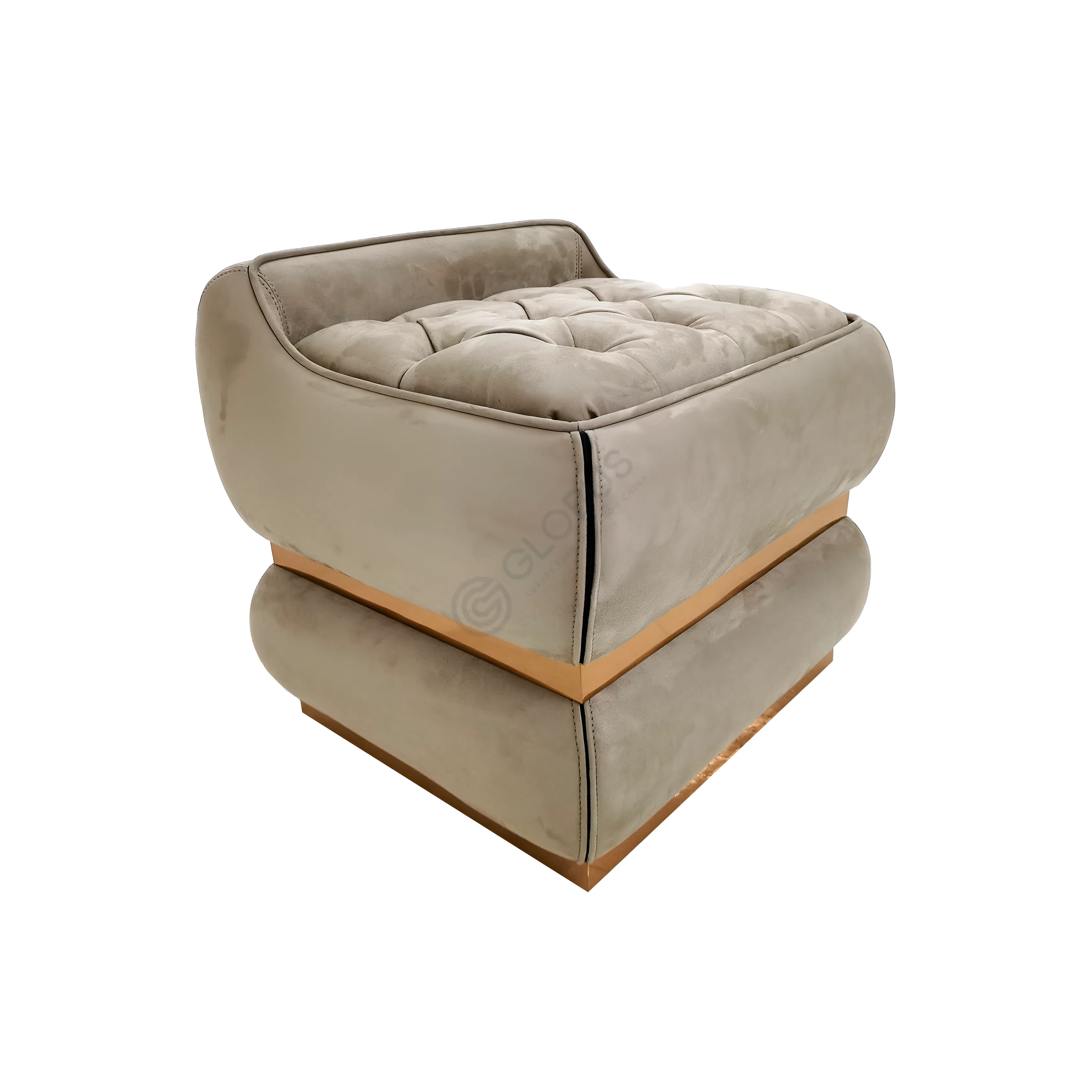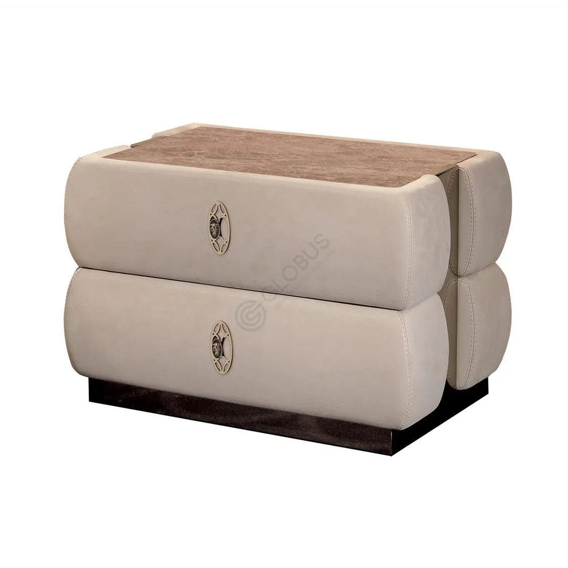 Каждый фасад ящика искусно обтянут мягчайшей экокожей на микрофибре, что придает поверхности бархатистую текстуру и визуальную глубину. Эти объёмные, слегка изогнутые формы, разделенные вертикальными вставками из сияющей нержавеющей стали, создают динамичный, но при этом гармоничный рисунок. Изящные золотистые ручки из полированной стали тонко дополняют облик, а венчающая композицию столешница из натурального мрамора привносит ноту природной роскоши и вечной красоты.