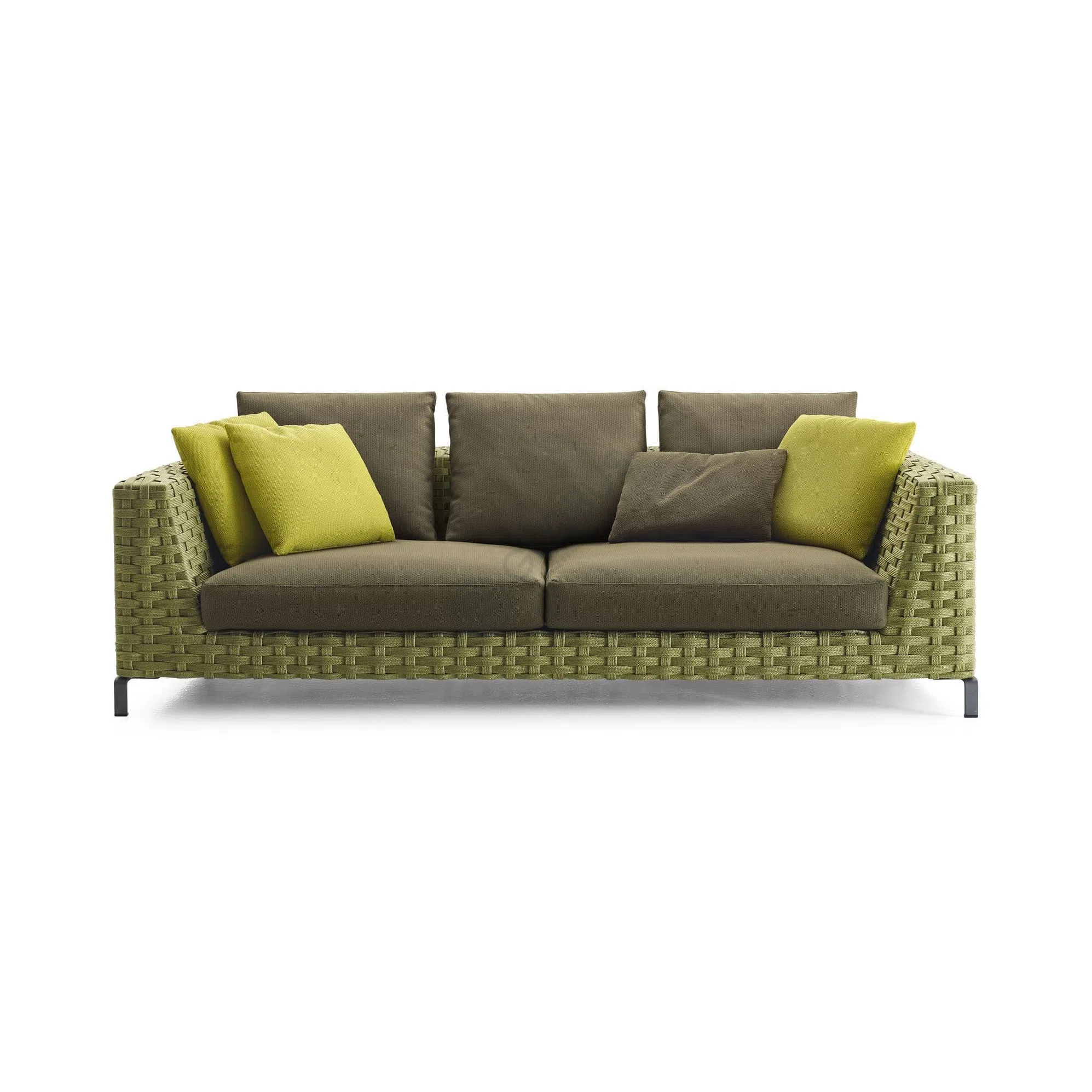 В основе изделия лежит прочный алюминиевый каркас, обеспечивающий долговечность и устойчивость к внешним воздействиям. Боковины и спинка выполнены с использованием элегантного плетения из специальной веревки, добавляющего уникальную текстуру и визуальную легкость. Мягкие подушки, обтянутые высококачественным текстилем, приглашают к полному расслаблению.