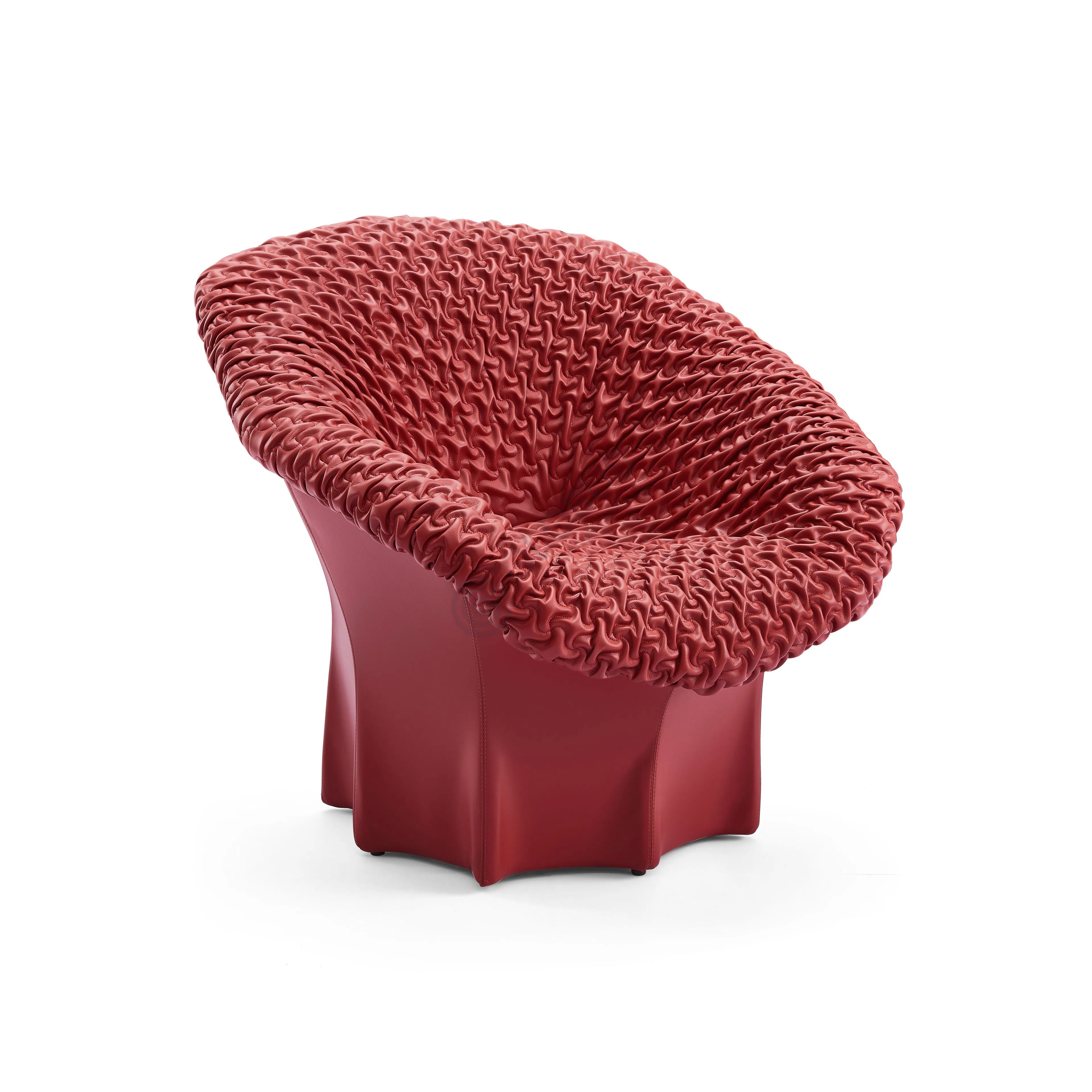 Представьте себе изысканный элемент современного интерьера, который притягивает взгляд своим уникальным дизайном. Этот пуф обладает необычной формой сиденья с фактурной поверхностью, напоминающей искусно выполненное плетение или объемный стежок. Его основание имеет четкие линии, создавая элегантный контраст с мягким верхом, и покрыто нежной, приглушенной кожей спокойного оттенка.