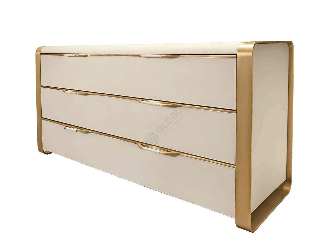 Предмет мебели выполнен с применением натурального дерева и фанеры, обеспечивающих прочность конструкции. Ощущение роскоши достигается благодаря использованию мягкой кожи и наполнения из пуха, что гарантирует исключительный комфорт. Металлические элементы добавляют изысканности и завершенности общему облику.