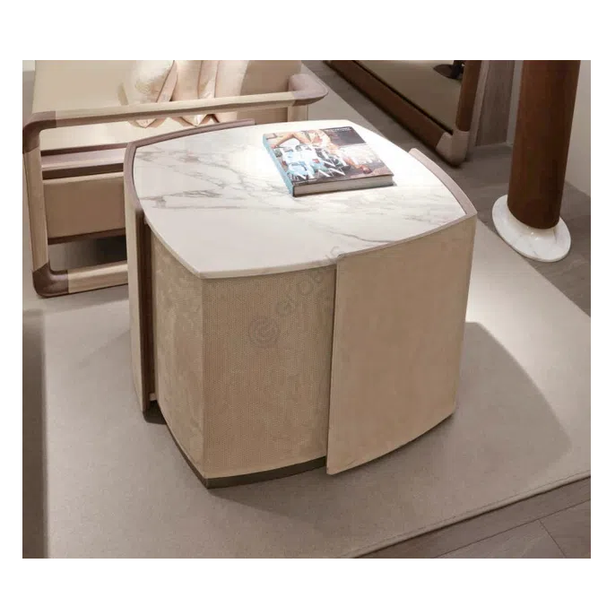 Этот журнальный столик станет центральным элементом современной гостиной, предлагая идеальное сочетание формы и функциональности. Его уникальная столешница из натурального мрамора с плавными линиями притягивает взгляд, демонстрируя изысканность природного камня.