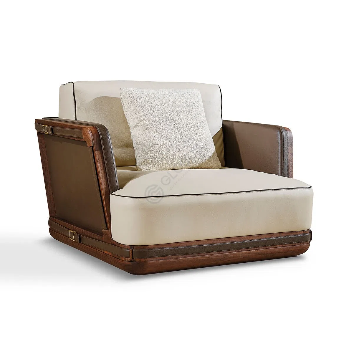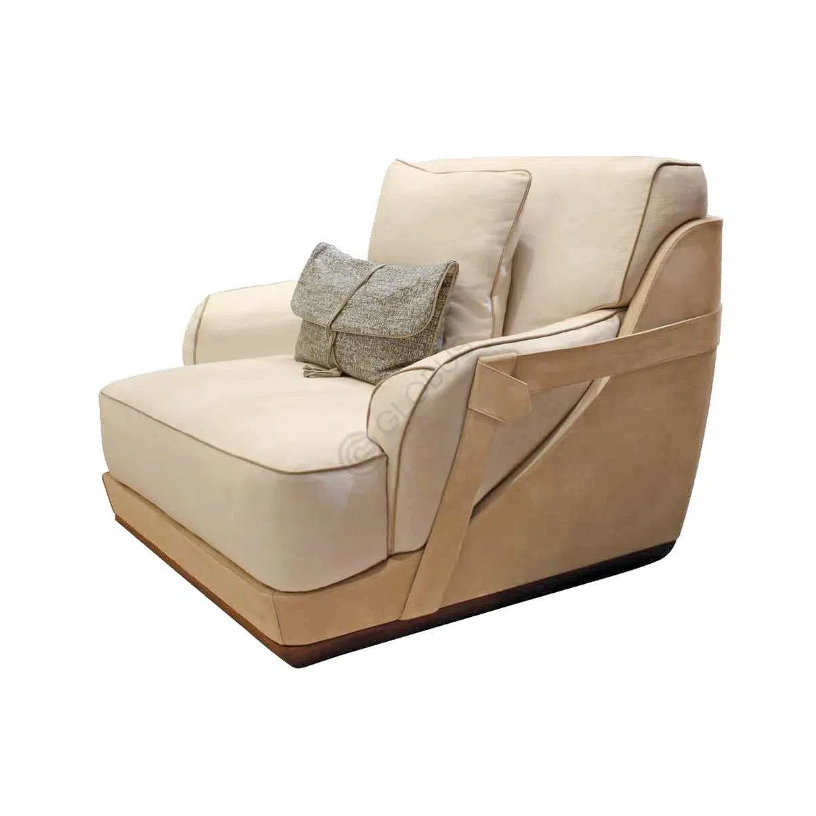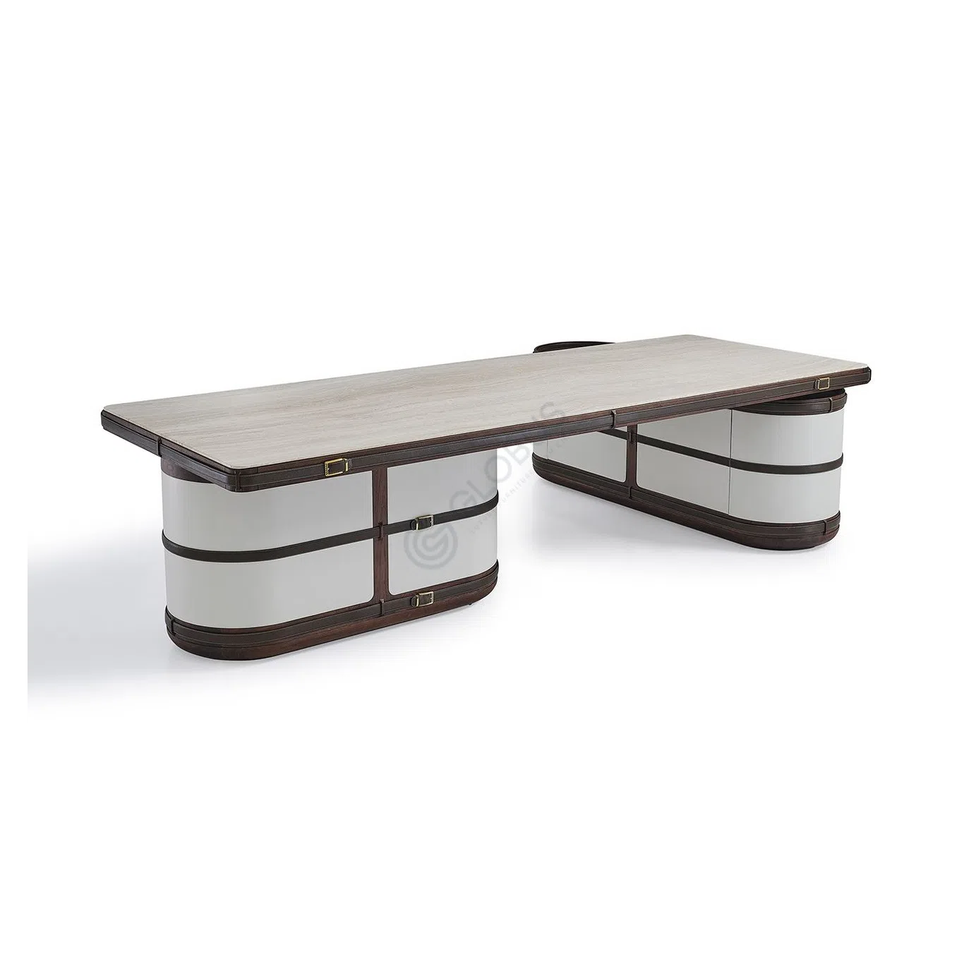 Декоративные элементы в виде полос из высококачественной кожи, закрепленных фурнитурой из нержавеющей стали, добавляют роскоши и утонченности. Нижний уровень столика предоставляет дополнительное место для размещения декора или предметов первой необходимости, подчеркивая функциональность изделия. Это предмет интерьера, призванный стать центральной точкой внимания в респектабельном доме.