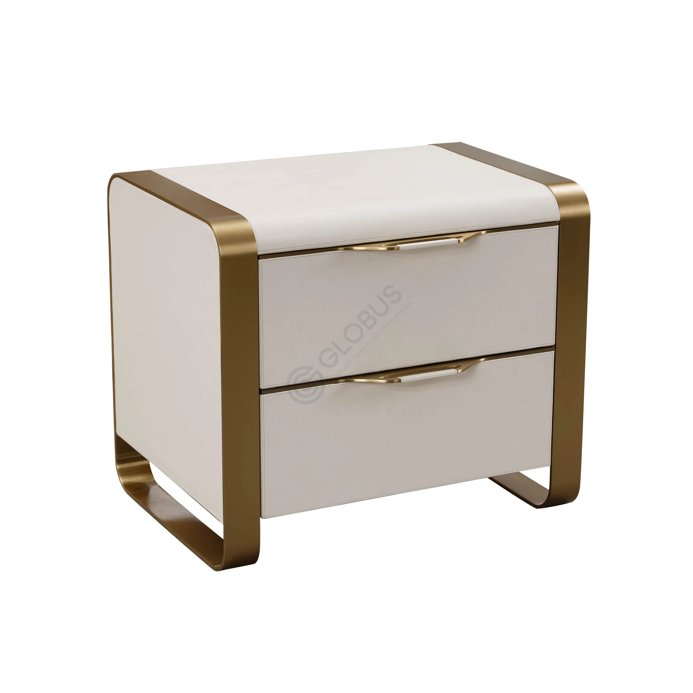 В основе конструкции использованы натуральное дерево и прочная фанера, обеспечивающие долговечность и надежность. Фасады ящиков и боковые поверхности обтянуты высококачественной кожей, придающей предмету особую мягкость и тактильное благородство. Детали из полированной нержавеющей стали цвета шампанского деликатно обрамляют форму, подчеркивая стилистическую принадлежность.