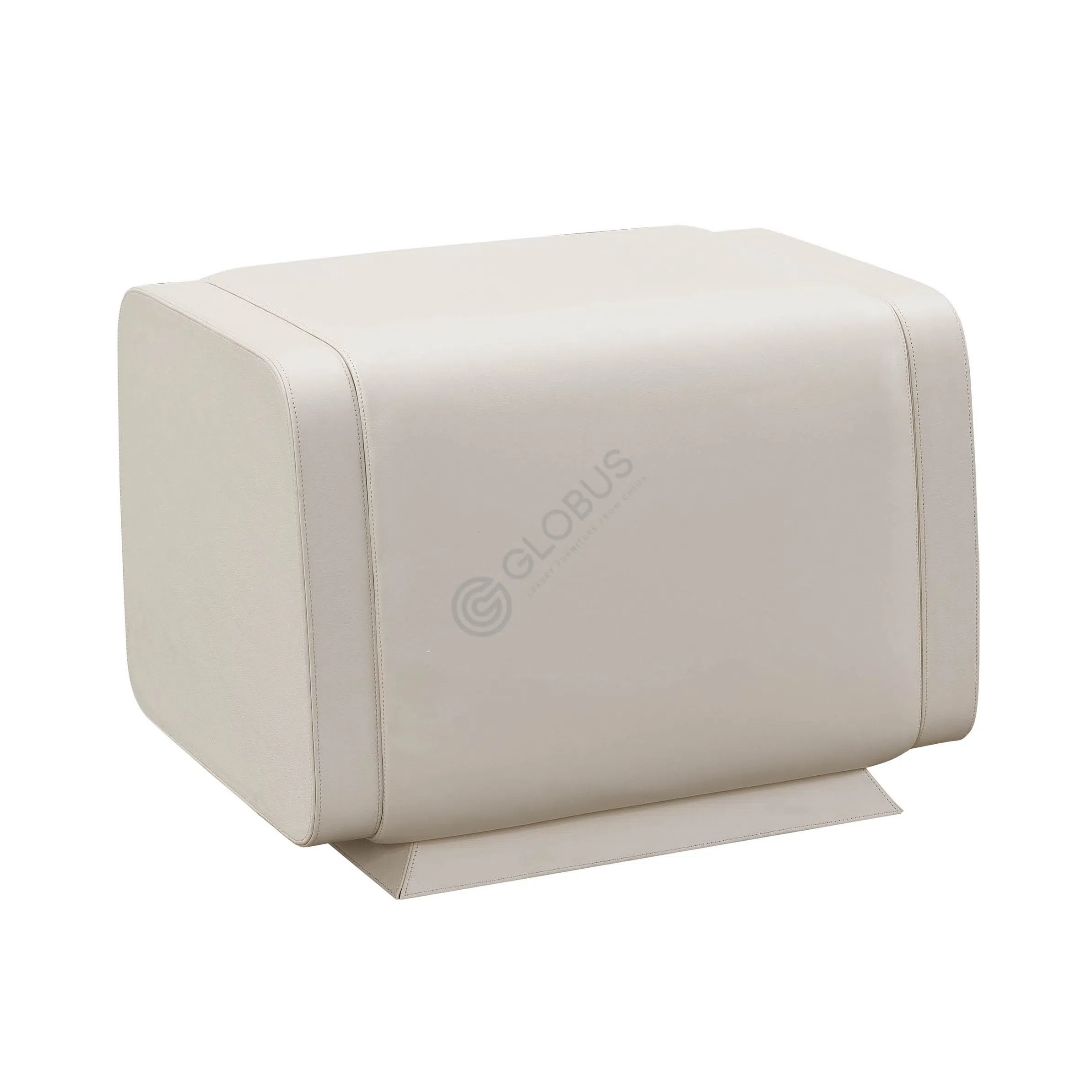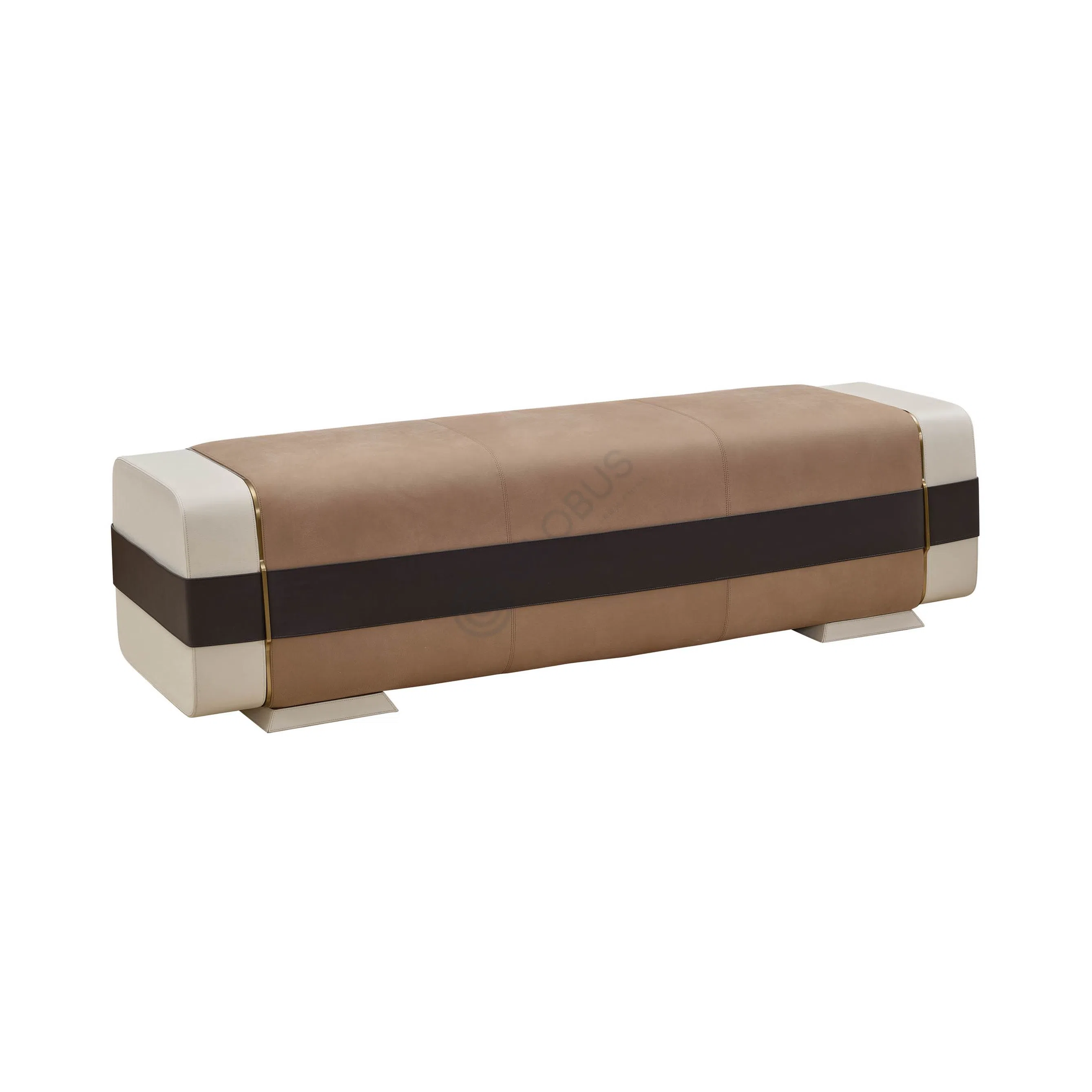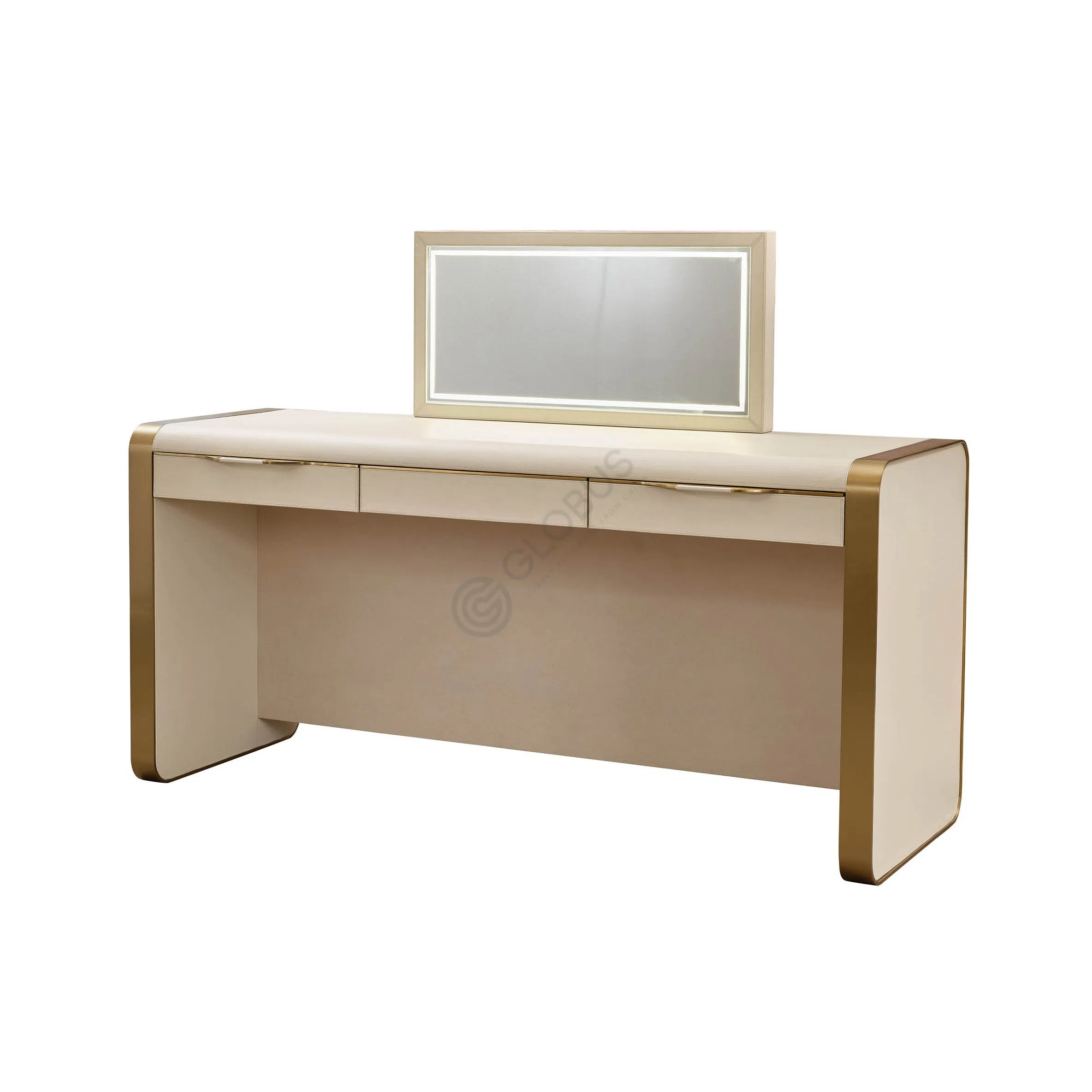 Основа предмета выполнена из комбинации натурального дерева и фанеры, что обеспечивает прочность и долговечность конструкции. Боковые элементы и основание представлены полированной нержавеющей сталью теплого оттенка, которая придает изделию роскошный и завершенный вид. Корпус и фасады ящиков обтянуты высококачественной кожей светлого тона, добавляя тактильной приятности и визуальной мягкости.