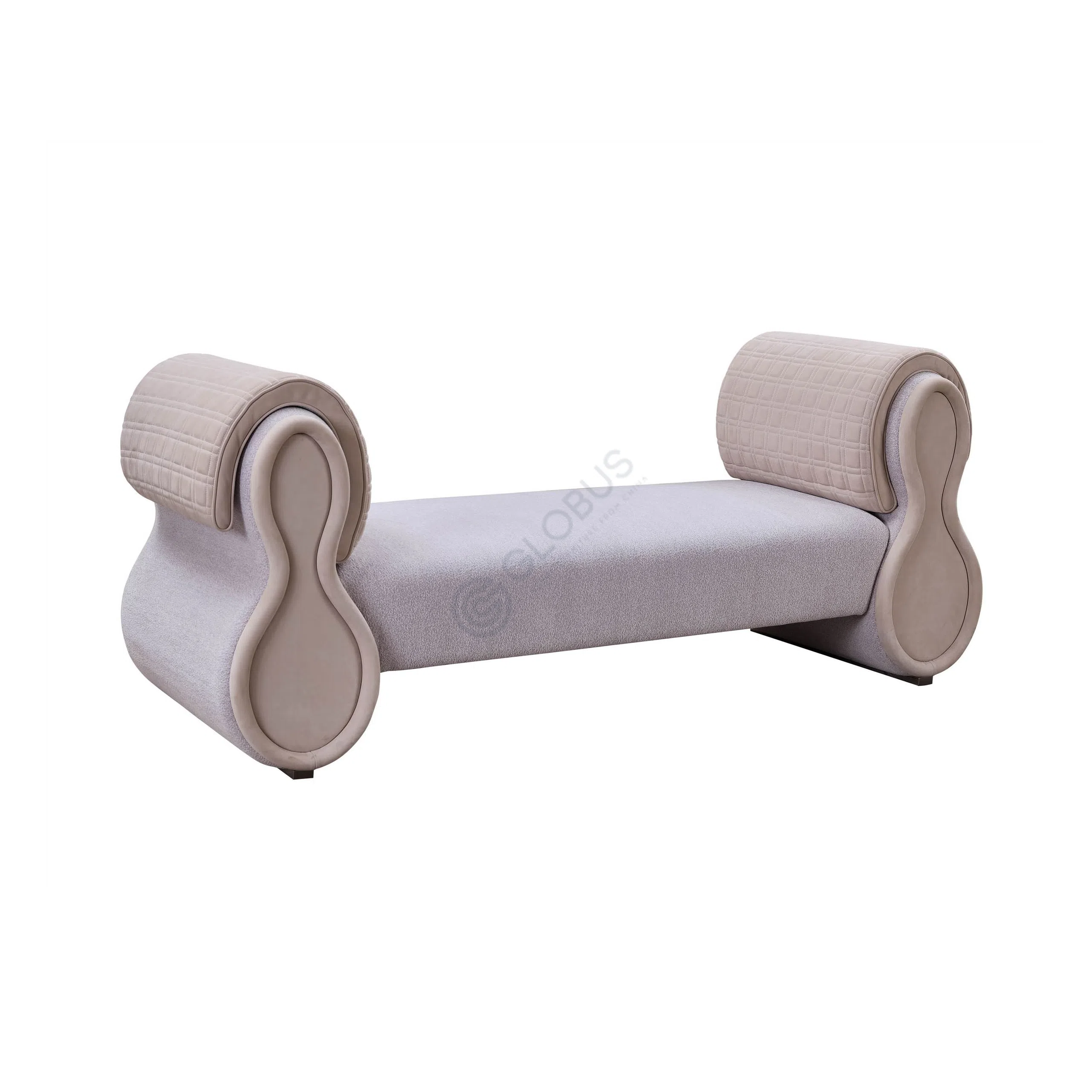 Основание и изголовье обиты нежным текстилем с тонким геометрическим узором и вставками из роскошной замши, что дарит приятное тактильное ощущение. Внутреннее наполнение пухом обеспечивает исключительную мягкость и комфорт. Прочный каркас изготовлен из натурального дерева и фанеры, а элементы из нержавеющей стали добавляют конструкции надежности и изысканности.