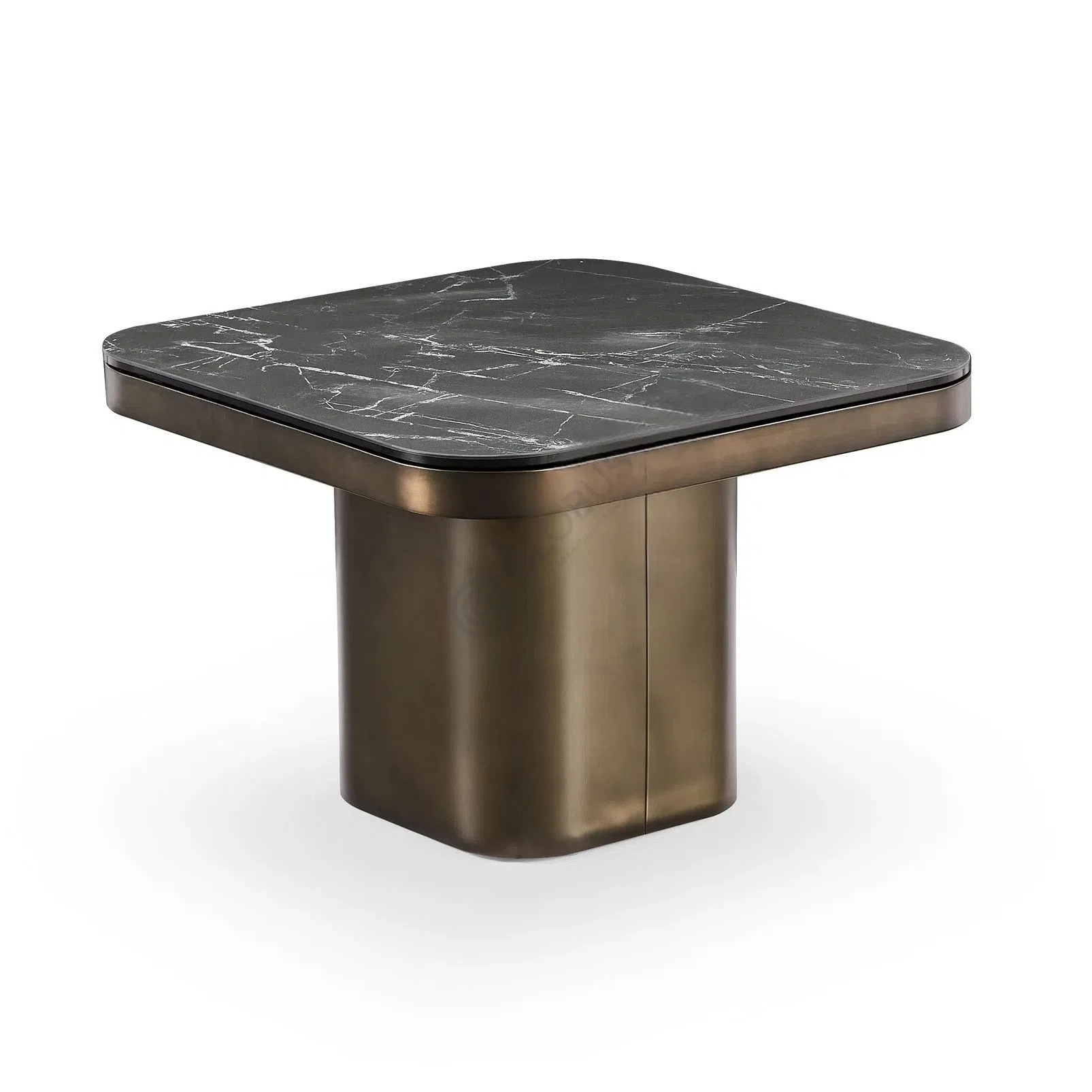 Верхняя часть изделия выполнена из натурального мрамора, каждый срез которого обладает неповторимым природным узором. Этот материал придает элементу мебели ощущение вечной классики и уникальности. Основание, изготовленное из нержавеющей стали, обеспечивает прочность и добавляет индустриальную нотку в эстетику, гармонично дополняя столешницу своими плавными, скругленными формами и сдержанным блеском.