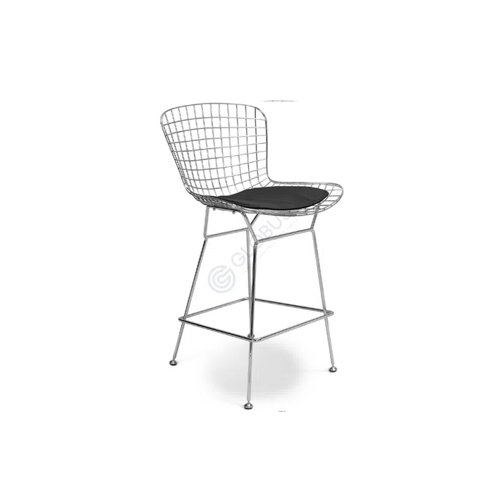 На металлическом каркасе располагается мягкое сиденье, обтянутое искусственной кожей (ПВХ). Этот материал выбран за его практичность и долговечность, а также за приятную на ощупь текстуру, обеспечивающую комфорт. Черный цвет подушки контрастирует с блеском металлической основы, подчеркивая современный стиль изделия.
