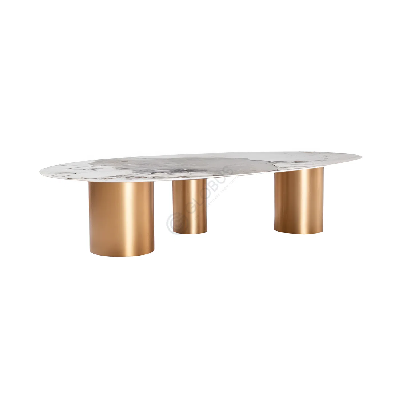 Опорой служит три массивных основания цилиндрической формы, выполненных из нержавеющей стали. Их отделка в теплом металлическом оттенке создает контраст с холодным камнем и привносит ощущение стабильности и современной роскоши в интерьер.