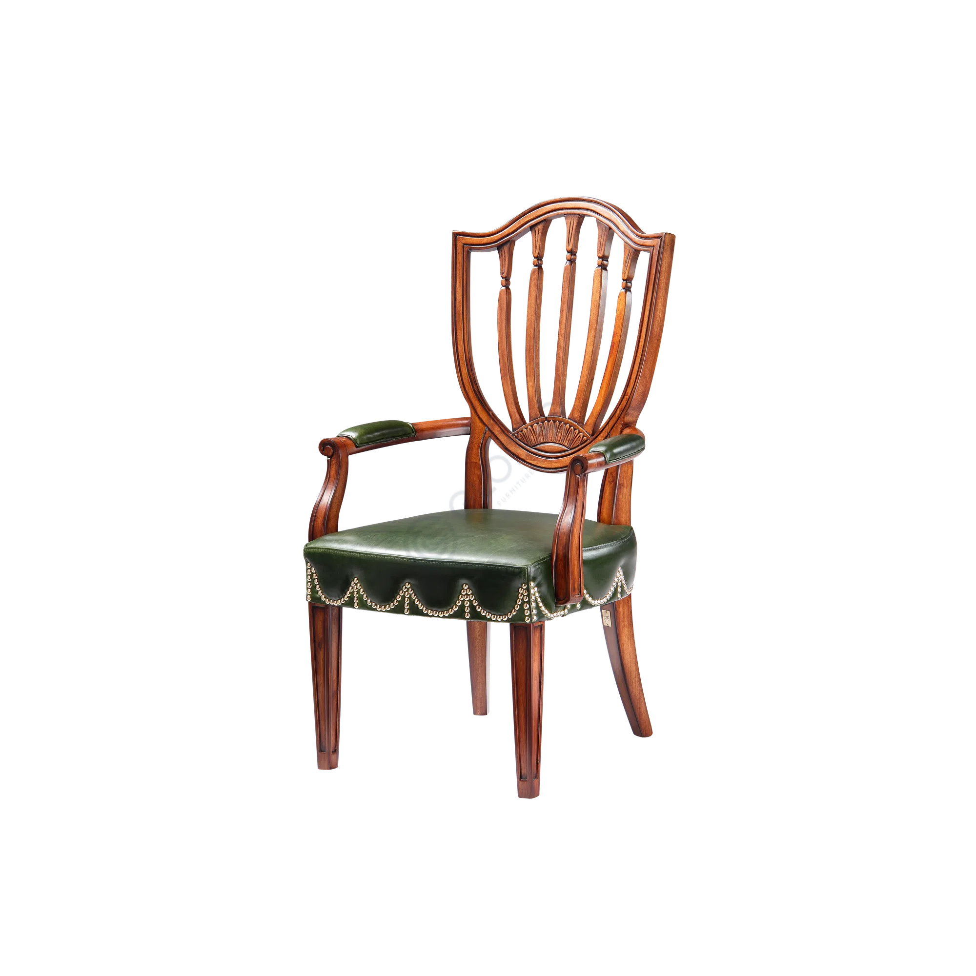 Изящная спинка с резными элементами напоминает о традиционных мотивах, создавая ощущение благородства. Сиденье обито натуральной кожей глубокого оттенка, а его периметр украшен декоративной отделкой с элементами, напоминающими жемчужины или гвоздики, добавляя роскоши. Опора выполнена из натурального дерева и МДФ, демонстрируя прочность и долговечность.