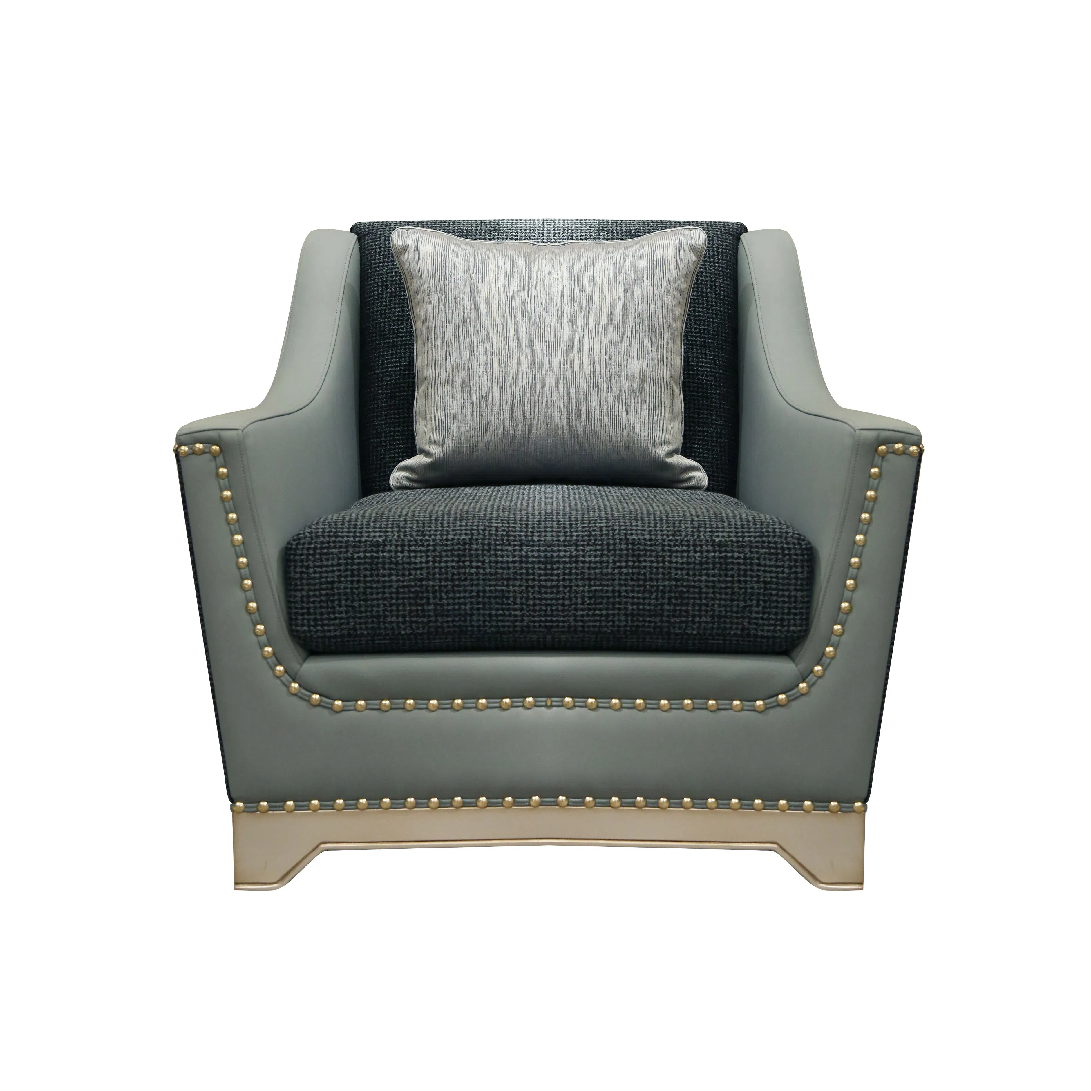 Конструкция основывается на прочном каркасе из натурального дерева и МДФ, гарантируя надежность и долговечность. Обивка представляет собой продуманное сочетание высококачественной кожи и мягкого текстиля, создавая приятную на ощупь поверхность и выразительный визуальный контраст. Дополнительную изысканность придают декоративные гвоздики, аккуратно расположенные вдоль основания и боковых частей.