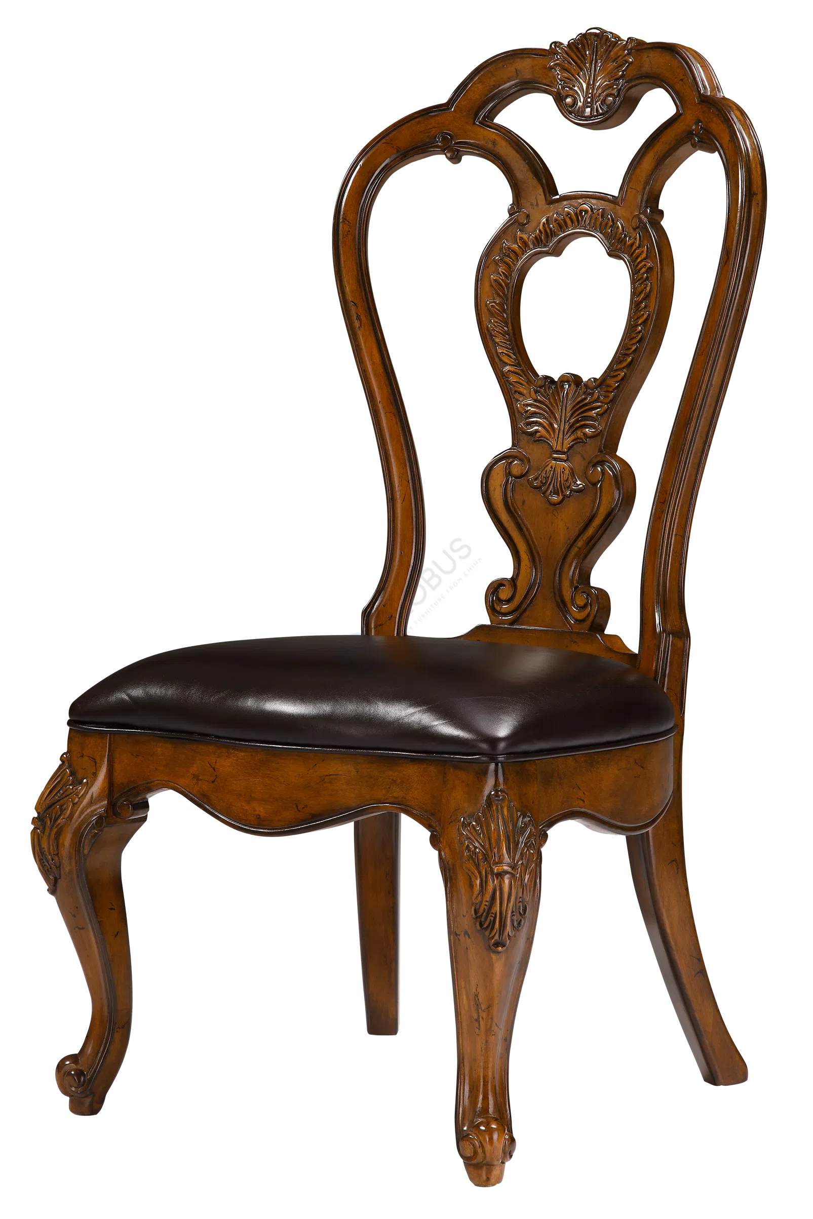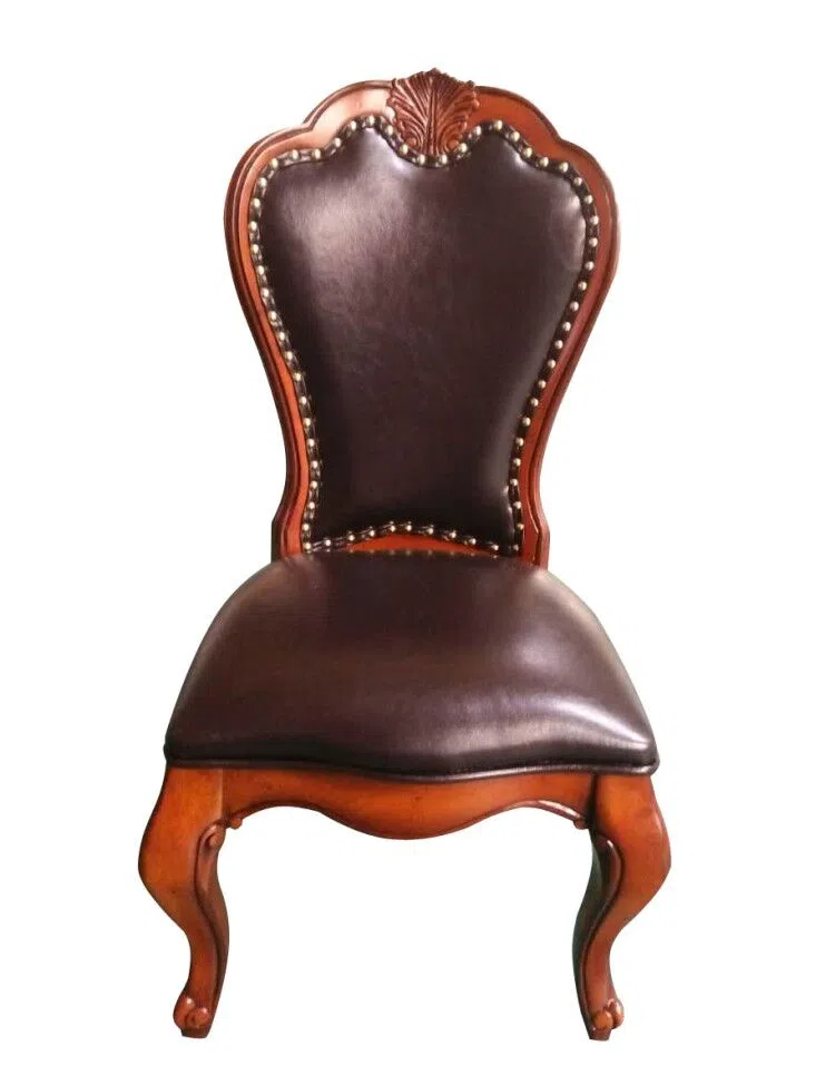 Каркас стула выполнен из массива натурального дерева, что обеспечивает его прочность и долговечность. Благородный оттенок древесины прекрасно сочетается с обивкой. Сиденье и высокая спинка обтянуты натуральной кожей глубокого цвета, даря исключительный комфорт и приятное ощущение при каждом прикосновении. В конструкции также применен МДФ для оптимальной стабильности.