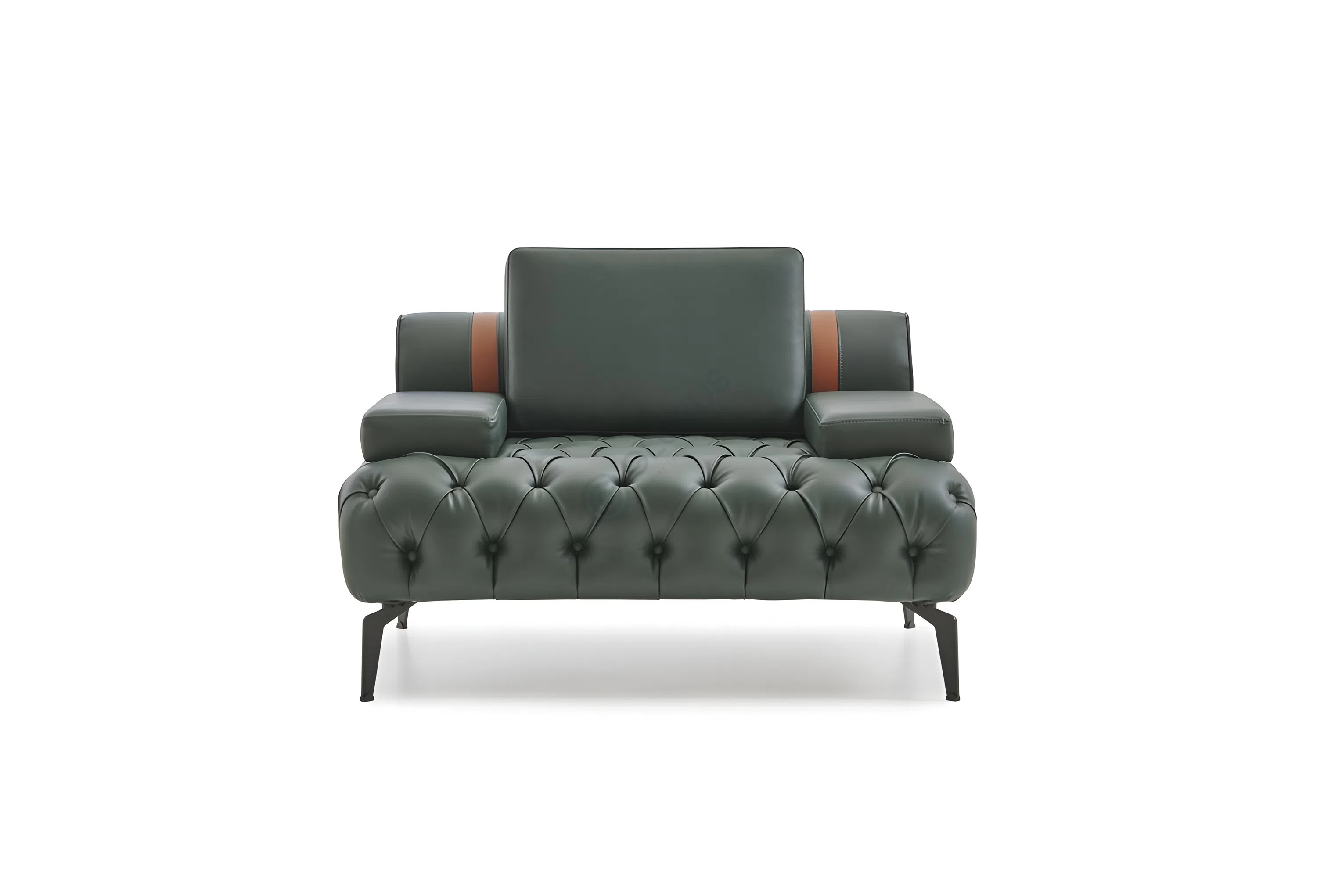 Капитоне на сиденье тонко подчеркивает внимание к деталям, придавая модели утонченность. Металлические ножки с золотистыми вставками добавляют легкости и визуально приподнимают диван над полом, что идеально вписывается в современный стиль. Этот диван станет центральным элементом гостиной, создавая атмосферу непринужденной роскоши.