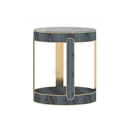 Круглая конструкция сочетает в себе природную роскошь и строгую геометрию: тонкая столешница из натурального мрамора переходит в ободок из тиснёной кожи, имитирующей змеиную фактуру, а опоры выполнены из полированного металла с золотистым оттенком.
