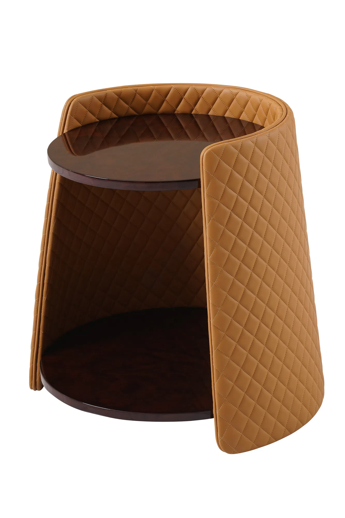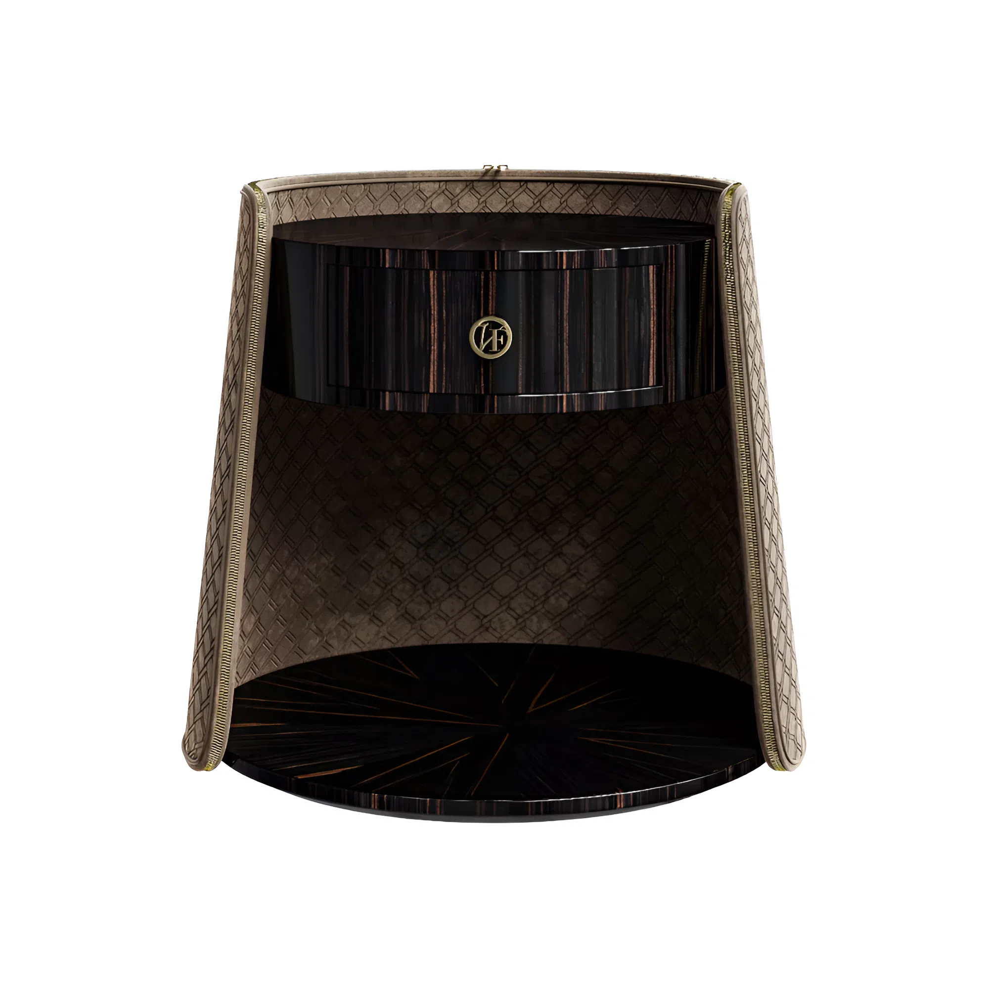 Отделка замшей не только придаёт изделию тактильную выразительность, но и защищает боковую часть от внешних повреждений. Такое сочетание натуральных материалов и металлических элементов создаёт атмосферу утончённости и уюта в гостиной.
