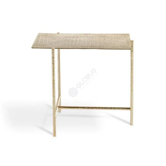 Журнальный столик выполнен из алюминия с тонким золотистым покрытием и рельефной поверхностью, отсылающей к графике ар-деко. Плоская квадратная столешница опирается на четыре стройных ножки с перекладинами, создавая ощущение воздушности и лёгкости конструкции.