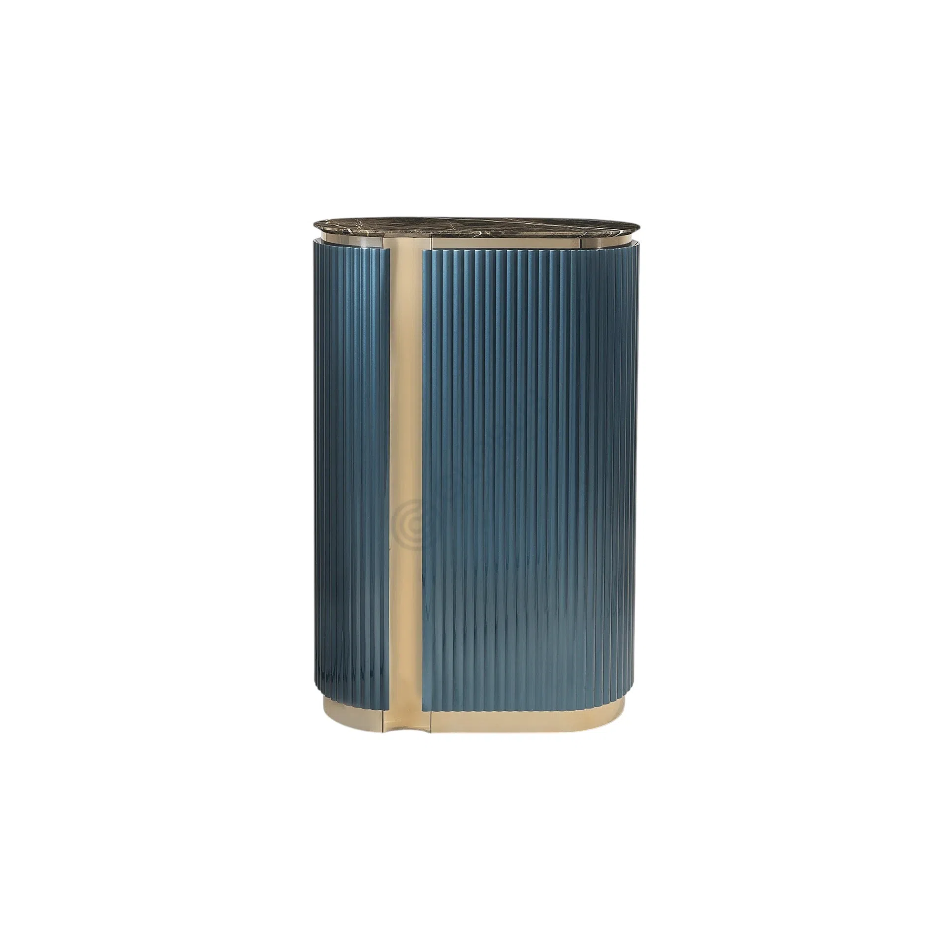Основание стола представляет собой продуманную композицию из благородных материалов. Блеск нержавеющей стали элегантно контрастирует с мягкой фактурой экокожи на микрофибре, которой отделана большая часть опоры. Рифленая отделка придает основанию ритмичность и дополнительный объем, подчеркивая геометрическую четкость форм, характерную для стиля ар-деко.