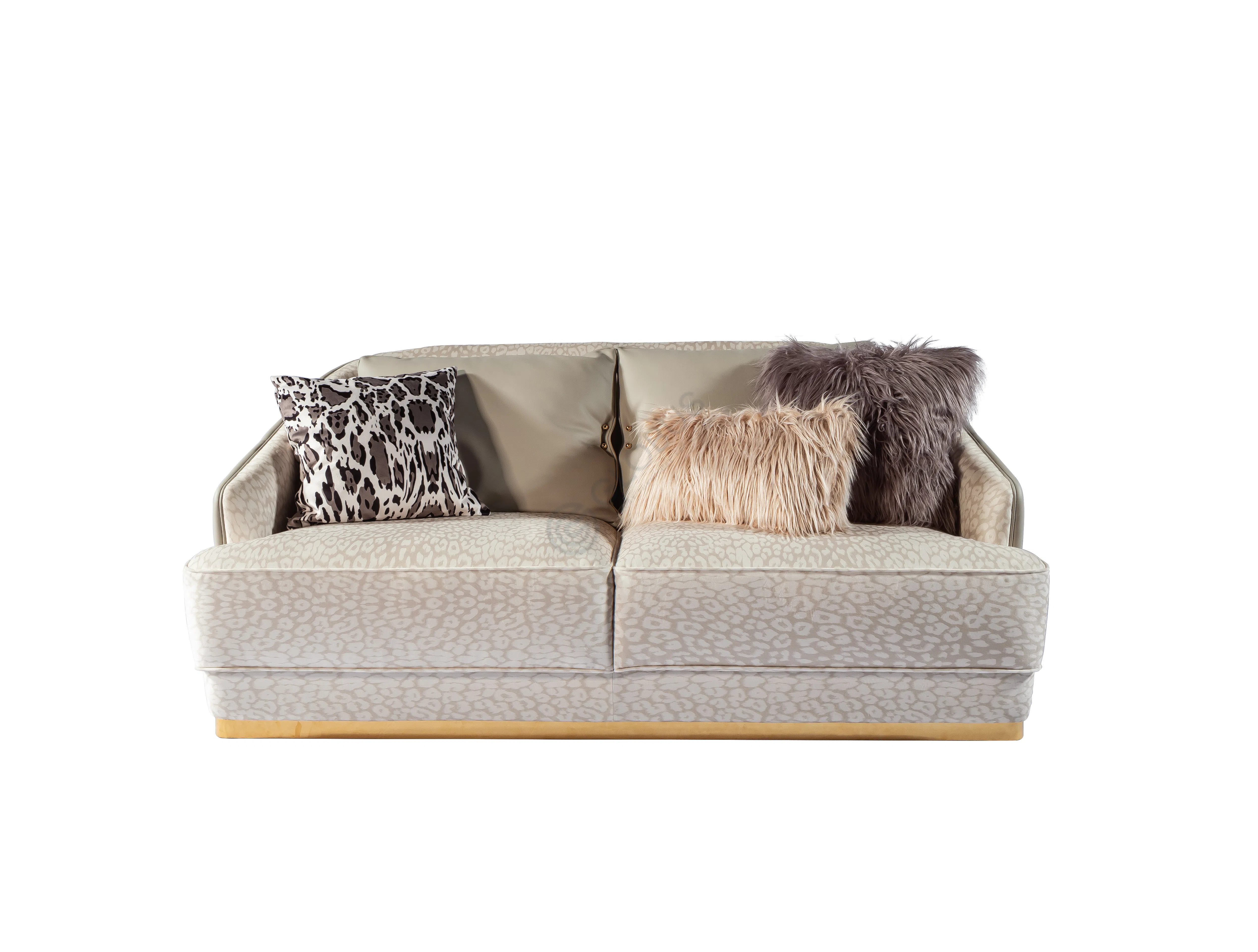Внутренняя часть отделана текстилем с деликатным жаккардовым рисунком, внешняя панель и сиденье — экокожей на микрофибре с мягким матовым блеском. Медные акценты в виде наконечников ножек и фурнитуры придают теплое свечение.