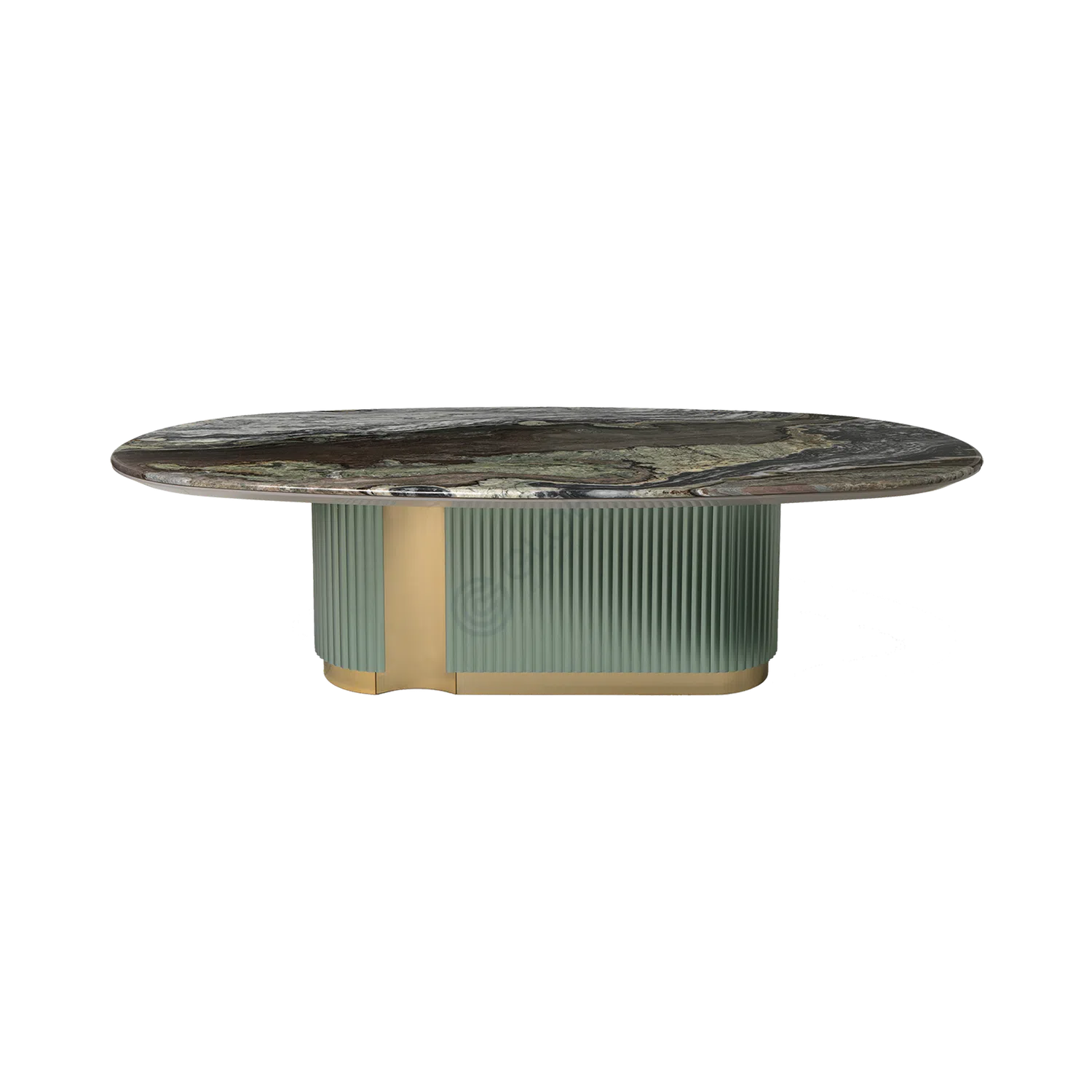 Столешница отлита из натурального мрамора с тонкой сеткой жилок, привнося в интерьер текстурный акцент. Опора собрана из полированной нержавеющей стали, отражающей мягкий свет и подчеркивающей изящество конструкции.