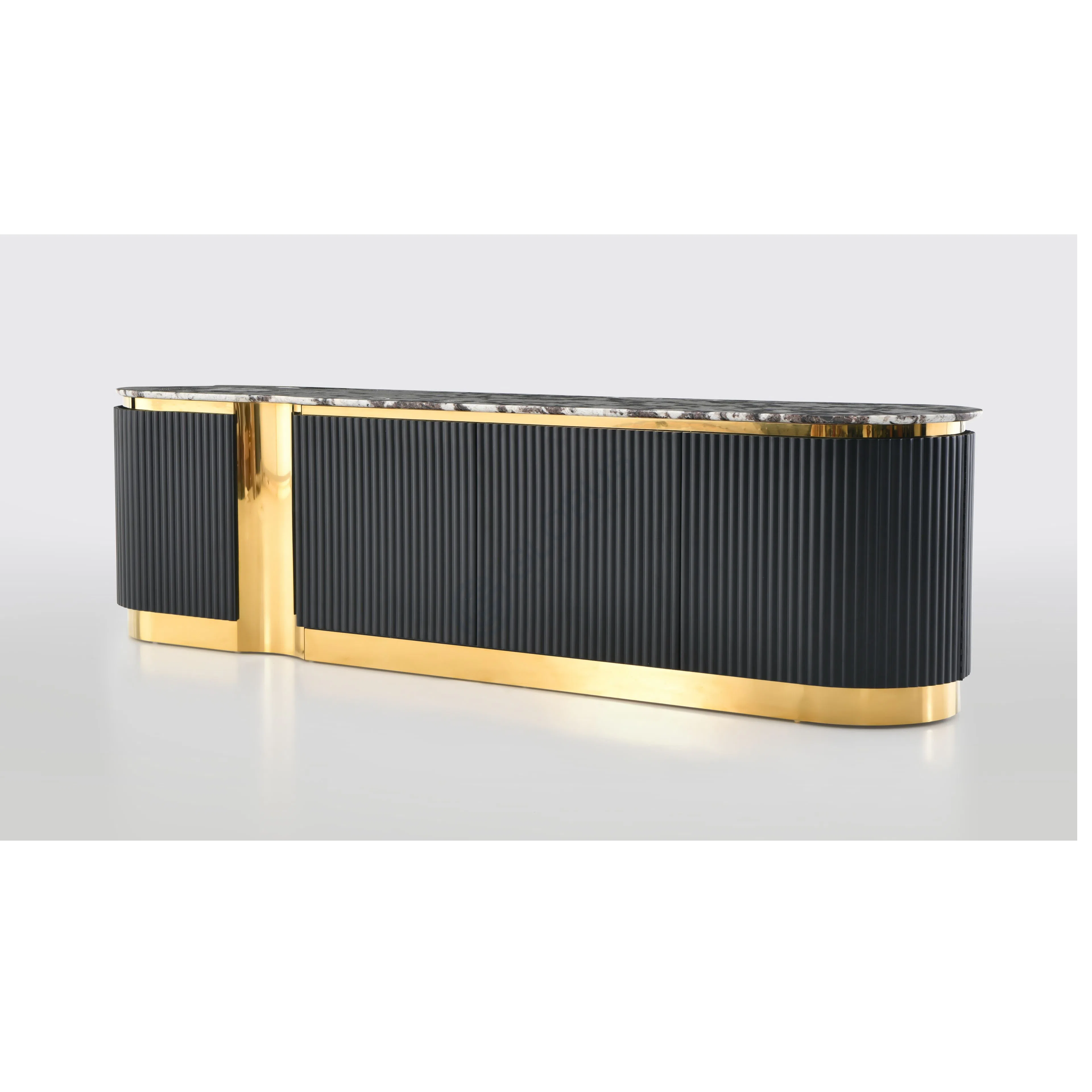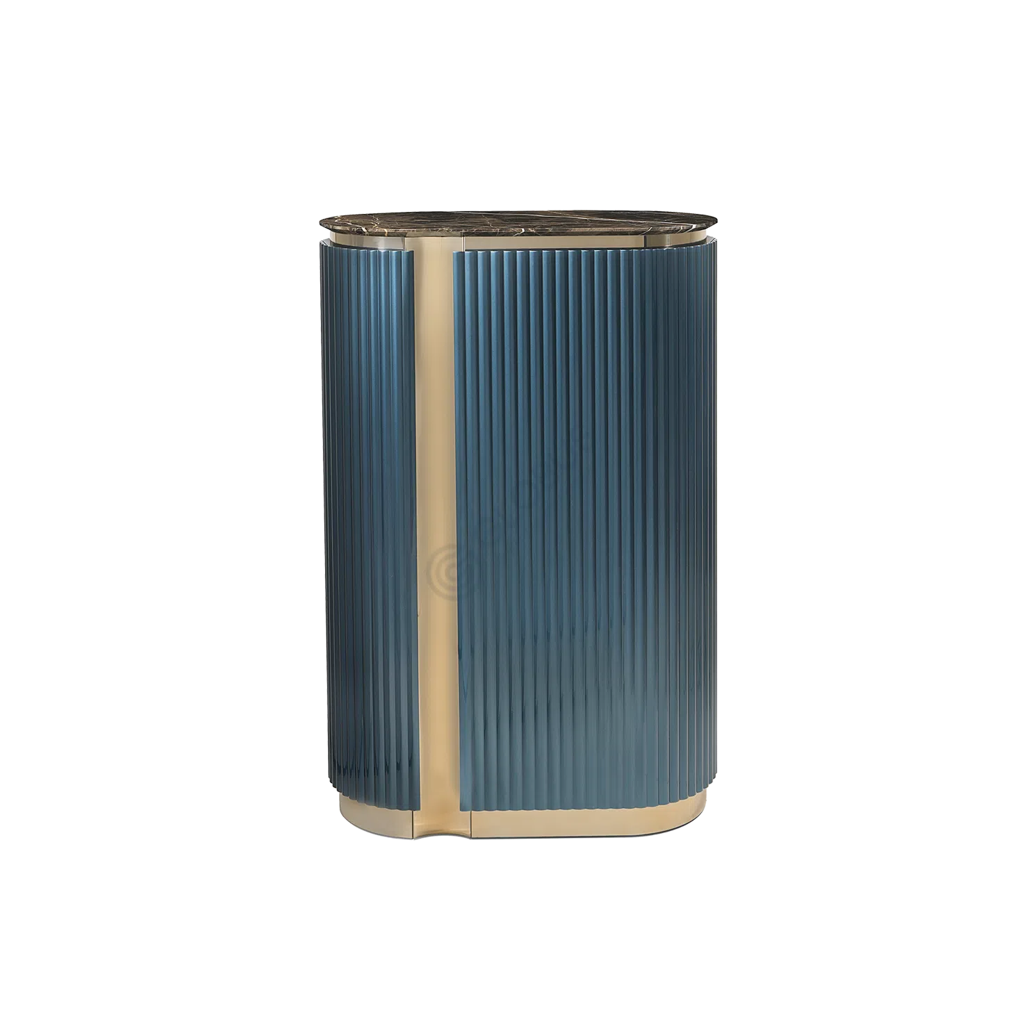 Прикроватная тумба выполнена в овальной форме, где строгие геометрические объёмы соседствуют с плавными линиями ар-деко. Профилированный корпус обшит матовым лаком жемчужного оттенка, а тонкие вертикальные рёбра создают ощущение ритма и лёгкости.