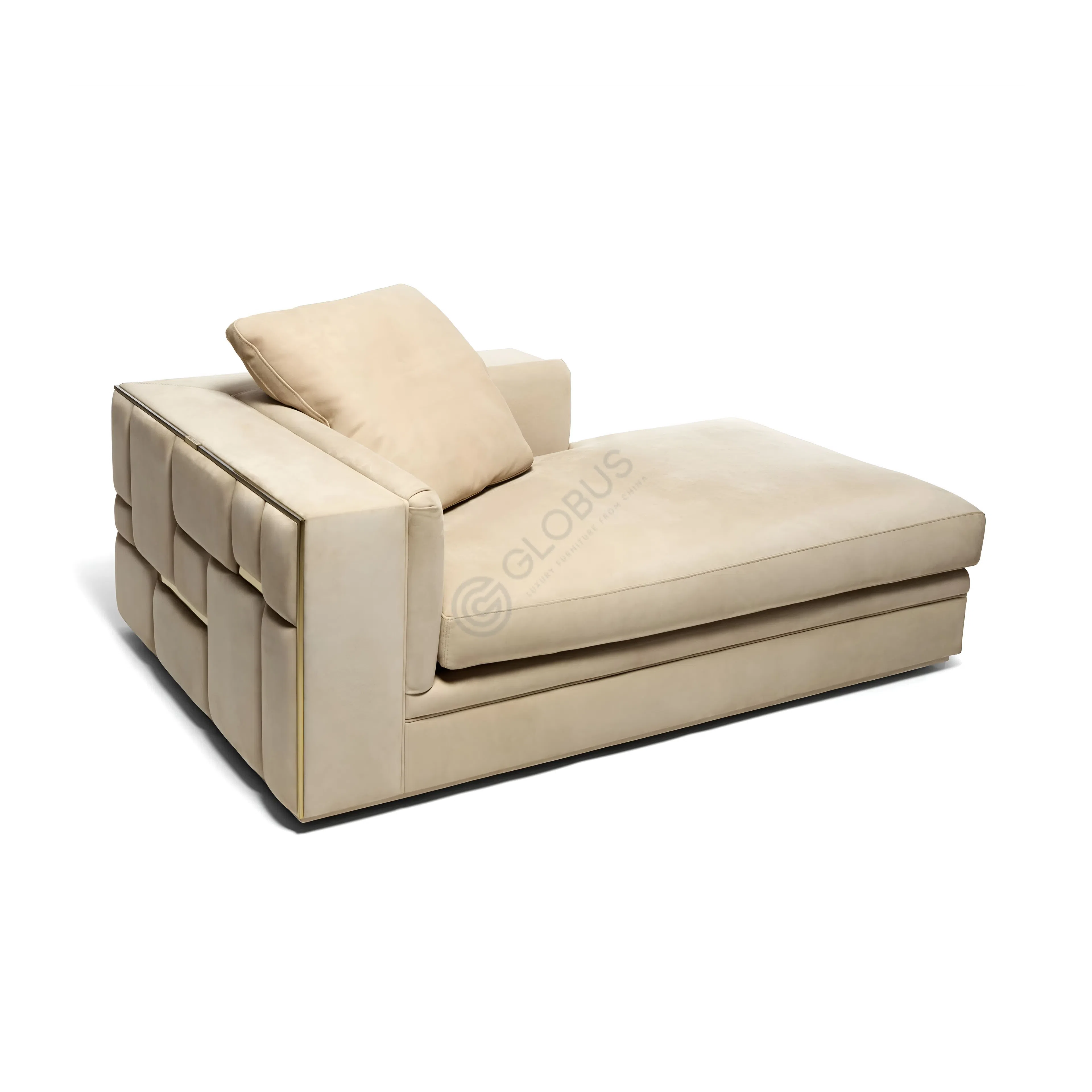 Обивка из нежного текстиля бежевого оттенка дарит приятные тактильные ощущения и подчеркивает мягкие линии. Особое внимание привлекает торцевая часть, где панели из натурального дерева и фанеры искусно дополнены вставками из нержавеющей стали, формирующими уникальный геометрический узор. Эти блестящие детали придают изделию стильное звучание и утонченный характер, отражая свет и добавляя пространству динамики. Надежный каркас, изготовленный из комбинации прочной древесины и фанеры, гарантирует долговечность и стабильность конструкции.