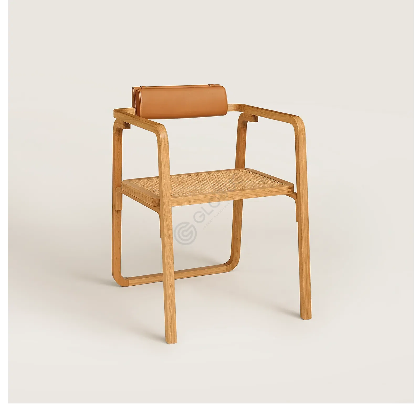 Каркас выполнен из благородного массива дерева, чья текстура придает изделию теплоту и основательность. Сиденье украшает изящное плетение из природного ротанга, добавляя легкости и воздушности общему облику. Дополнительным штрихом является валик для спины, обтянутый мягкой кожей, подчеркивающий внимание к каждой детали.
