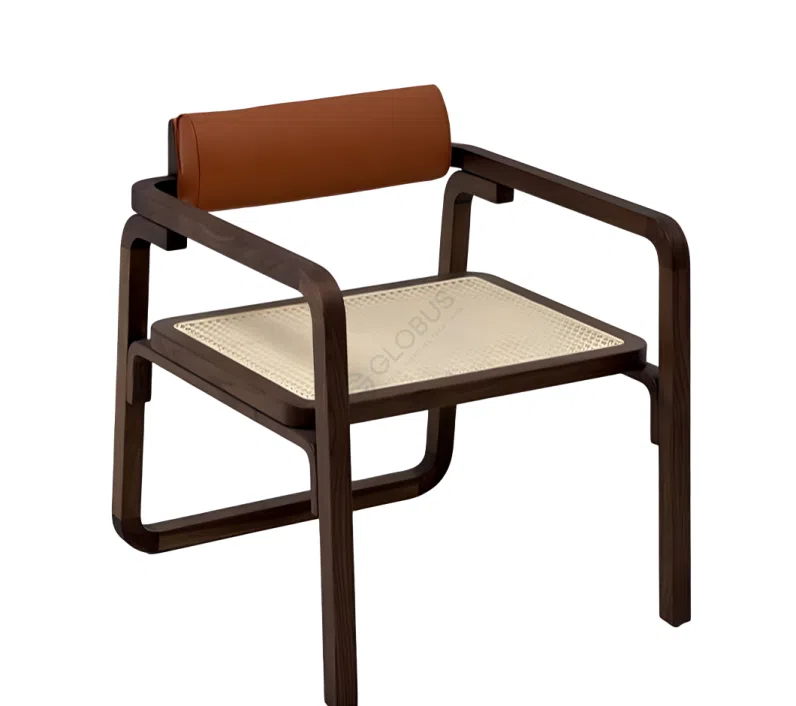 Основой служит каркас из натурального дерева, тщательно обработанный для достижения идеальной гладкости и тактильного комфорта. Сиденье, сплетенное из натурального ротанга, придает конструкции воздушность, а его естественная текстура приглашает к непринужденному отдыху. Акцентным элементом выступает валикообразная подушка для спины, обитая натуральной кожей насыщенного оттенка, которая добавляет нотку утонченности и предлагает мягкую поддержку.