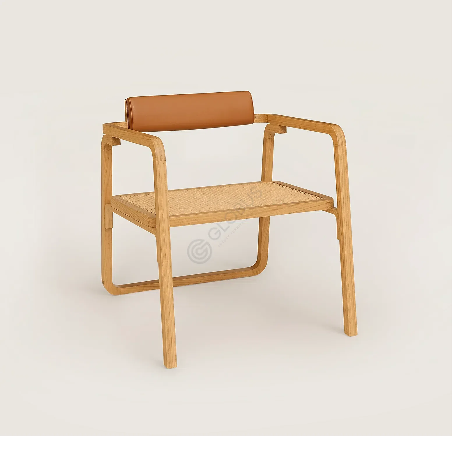Изгиб натурального дерева формирует изящный каркас, демонстрируя легкость и прочность конструкции. Сиденье выполнено из натурального ротанга с искусным плетением, добавляя изделию текстурности и визуальной привлекательности. Контрастное акцентное пятно создает подушка на спинке, обитая натуральной кожей, которая обещает комфортную поддержку.