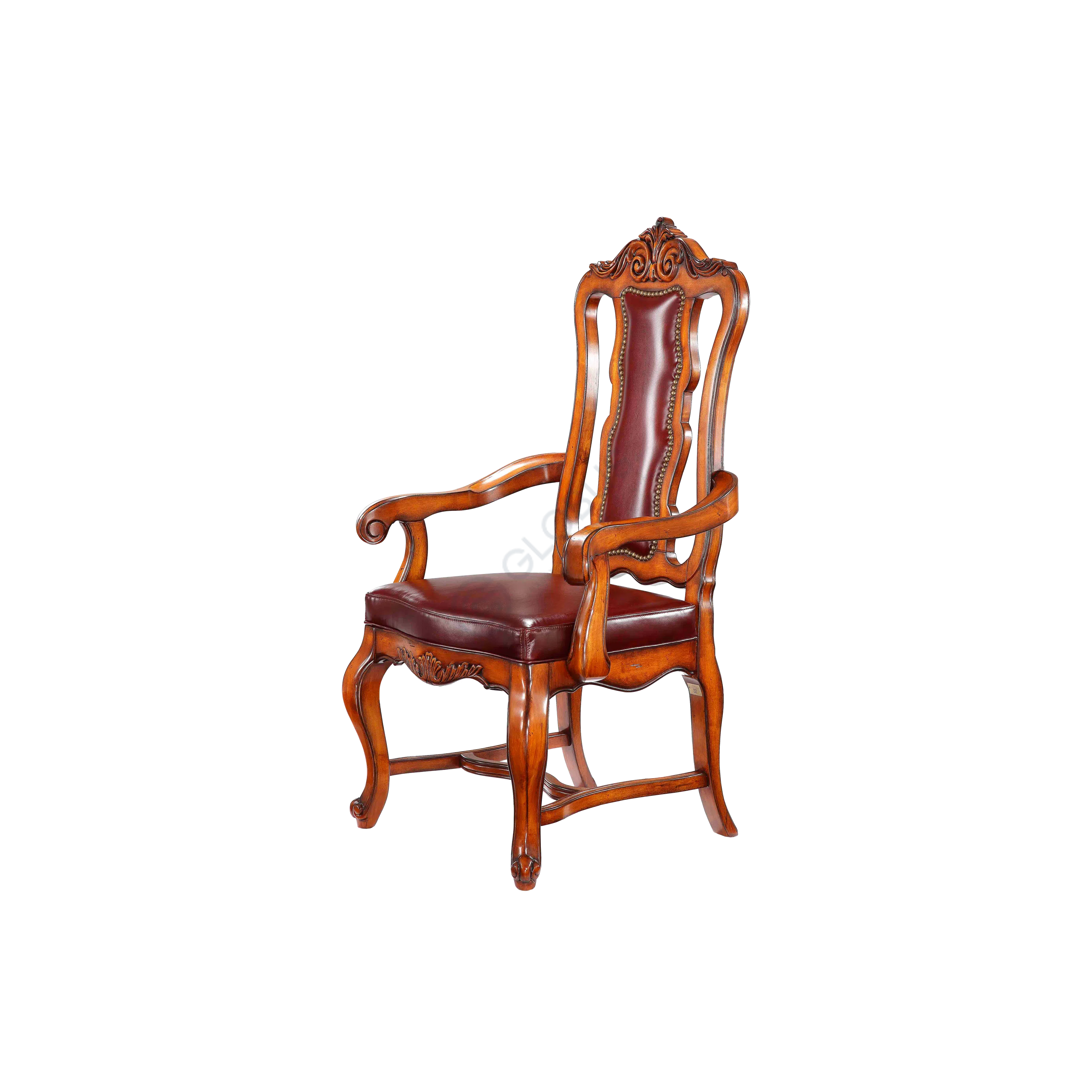 Основу конструкции составляет массив натурального дерева, который обеспечивает прочность и долговечность. Теплый оттенок древесины прекрасно сочетается с обивкой сиденья и спинки, выполненной из высококачественной кожи. Нежное мерцание кожаной поверхности подчеркивает статус изделия, а декоративные элементы, возможно выполненные из МДФ с искусно нанесенной резьбой, добавляют визуальную привлекательность и утонченность.