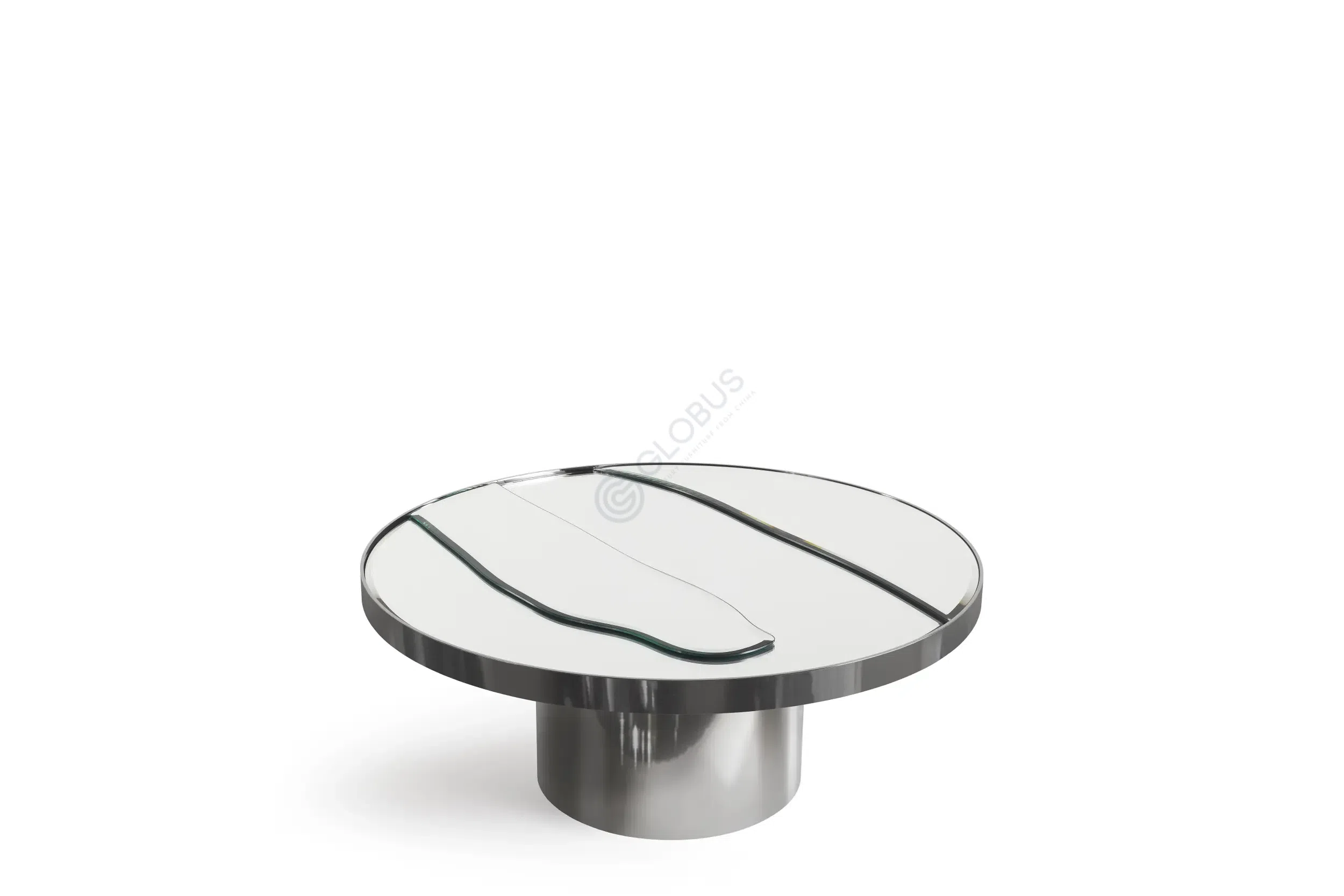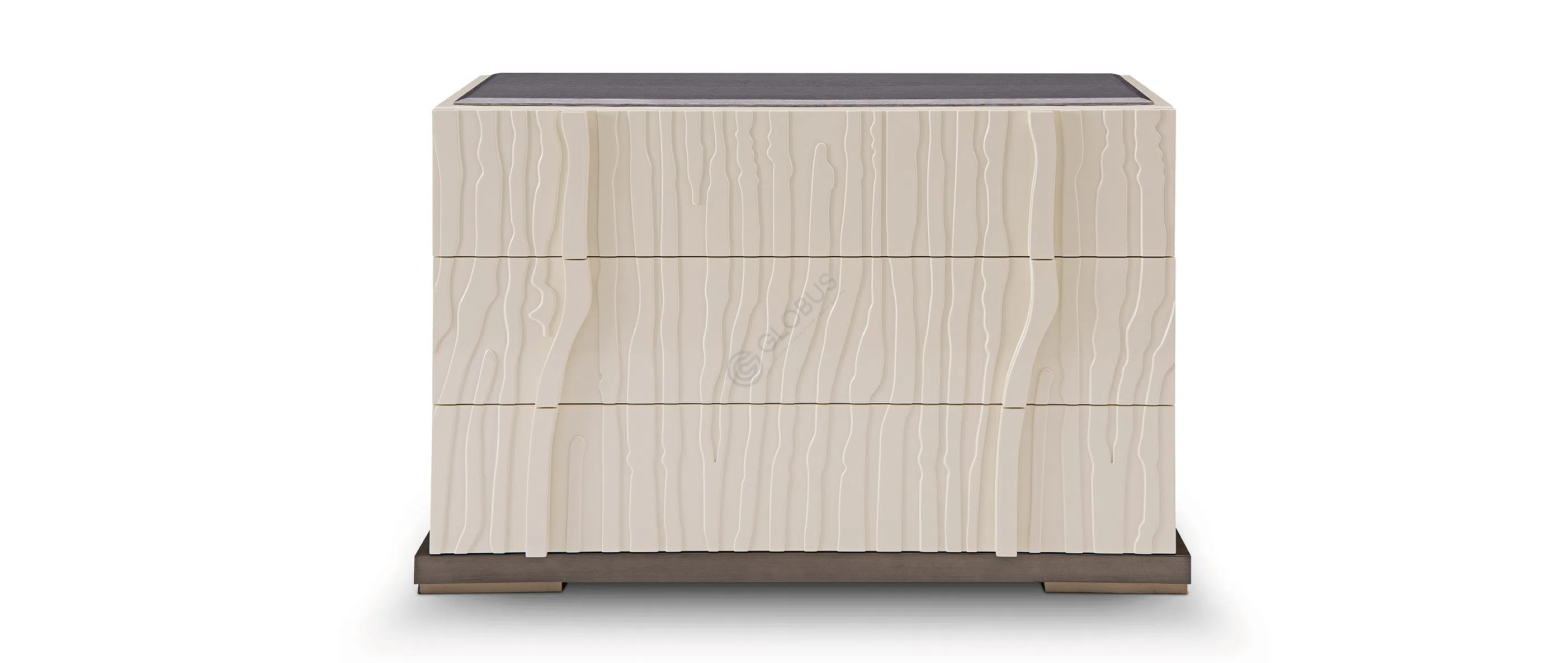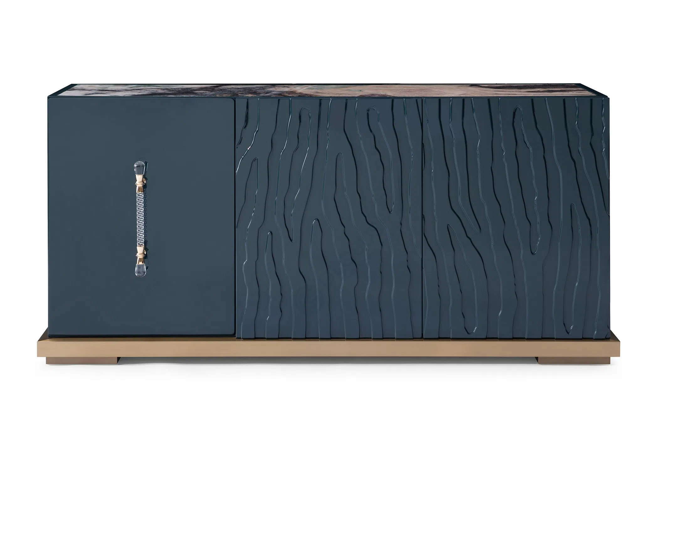 Модель предлагает две скрытые задвижные ниши и один открытый отсек на уровне удобного доступа. Низкие ножки с золотистой отделкой создают ощущение невесомости. Такое решение органично дополнит интерьер гостиной или спальни.