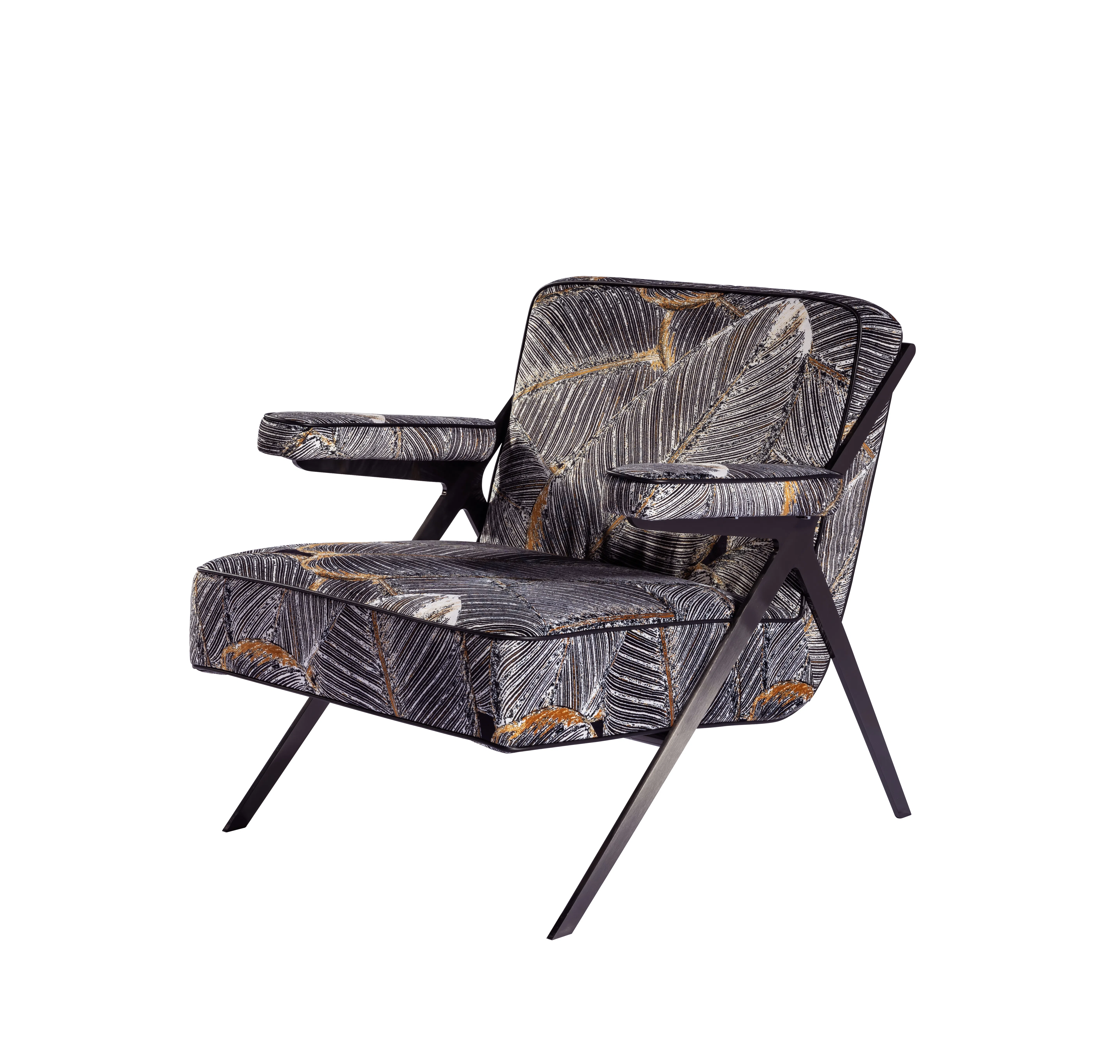 Основание стула выполнено из полированной нержавеющей стали золотистого оттенка, чья геометрическая форма привносит динамику в его облик. Сиденье и спинка обиты высококачественным текстилем глубокого черного цвета. Изысканная ромбовидная стежка, с уникальным рисунком на спинке, подчеркивает мастерство исполнения и добавляет тактильного удовольствия.