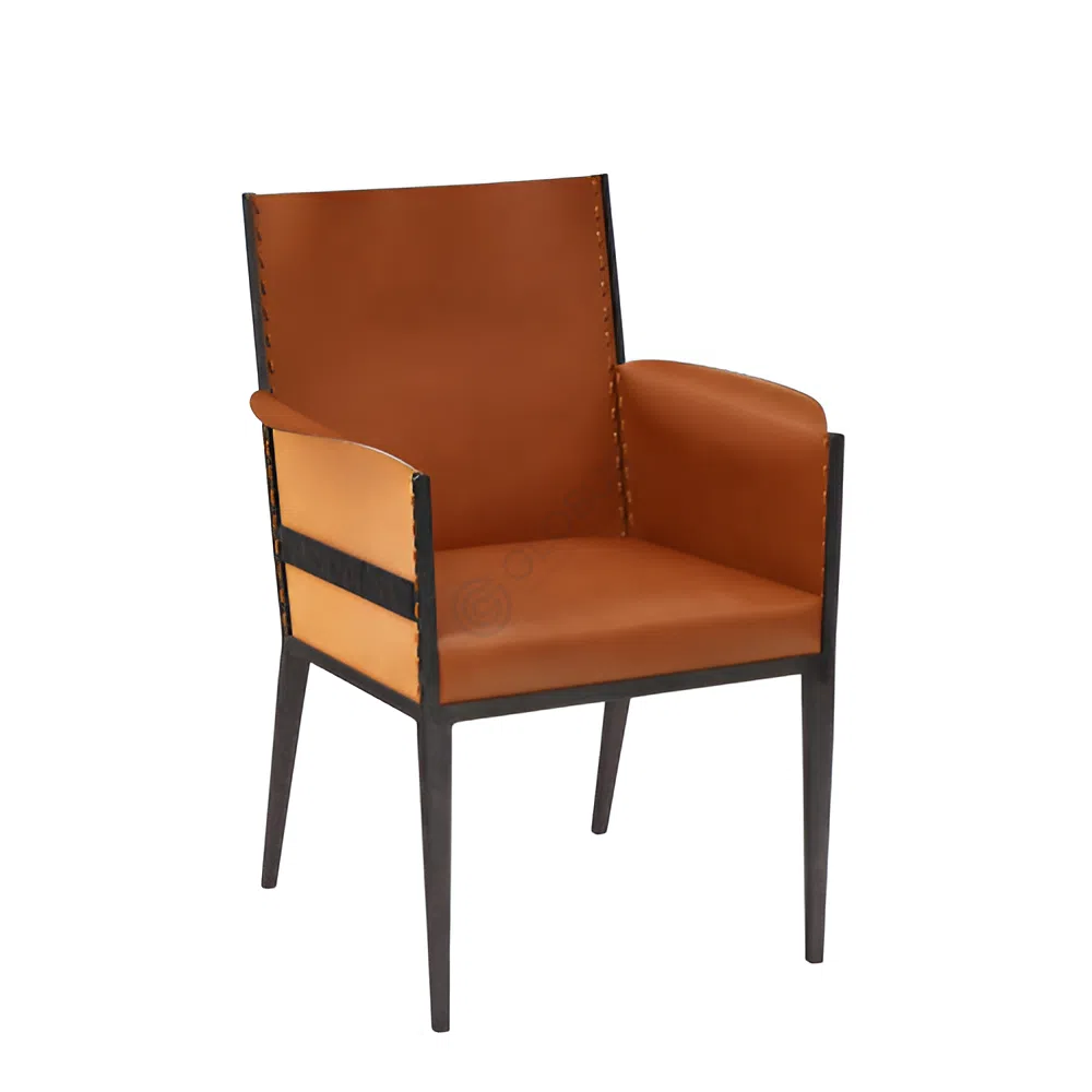 Сидение и спинка обтянуты шорно-седельной кожей насыщенного коньячного оттенка, придающей изделию теплоту и неповторимый характер. Ручная прострочка по краям не только надежно фиксирует материал, но и служит изысканным декоративным элементом, подчеркивая искусную работу и стремление к бескомпромиссному качеству. Прикосновение к этой коже дарит ощущение благородства и долговечности.