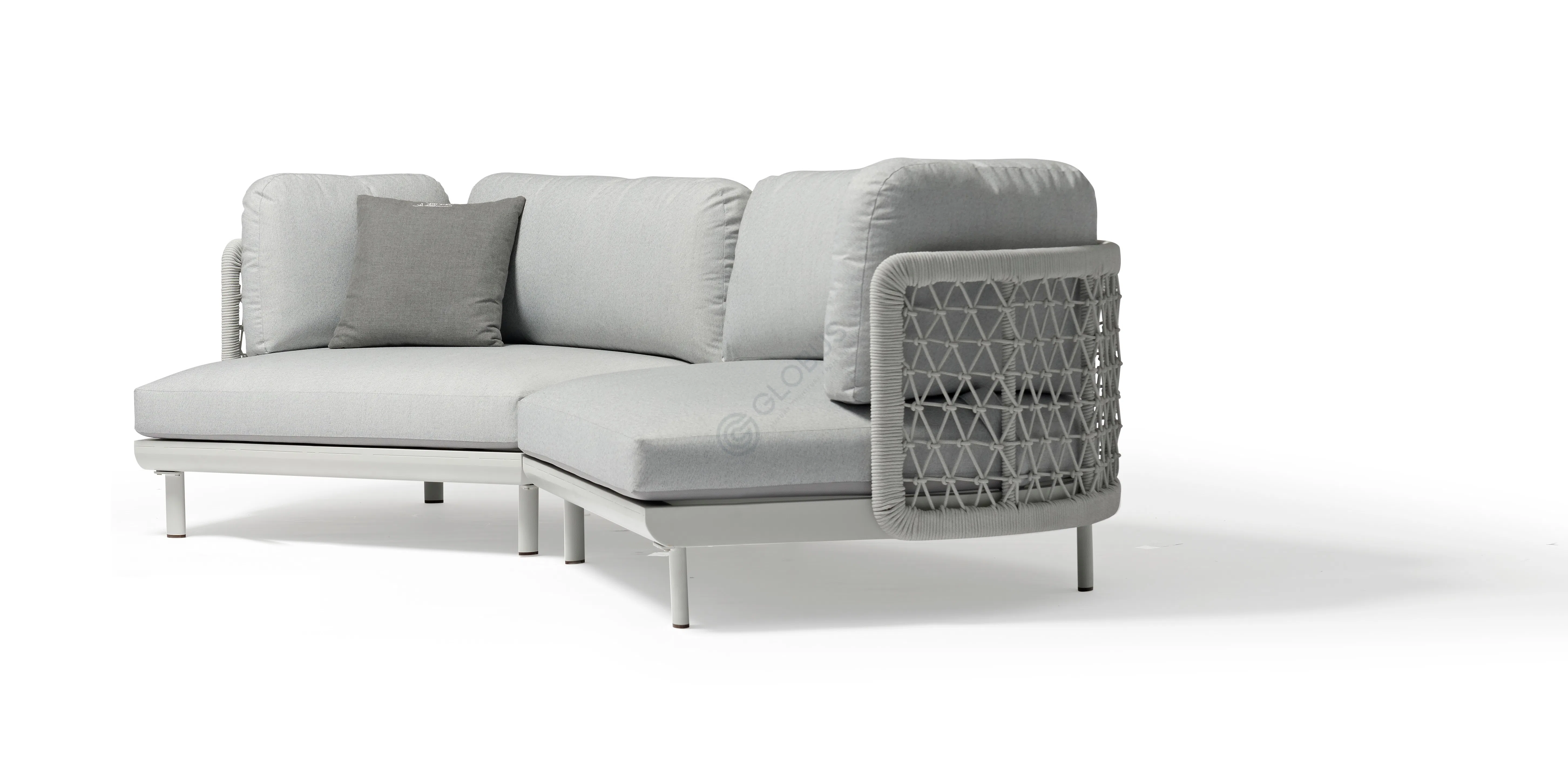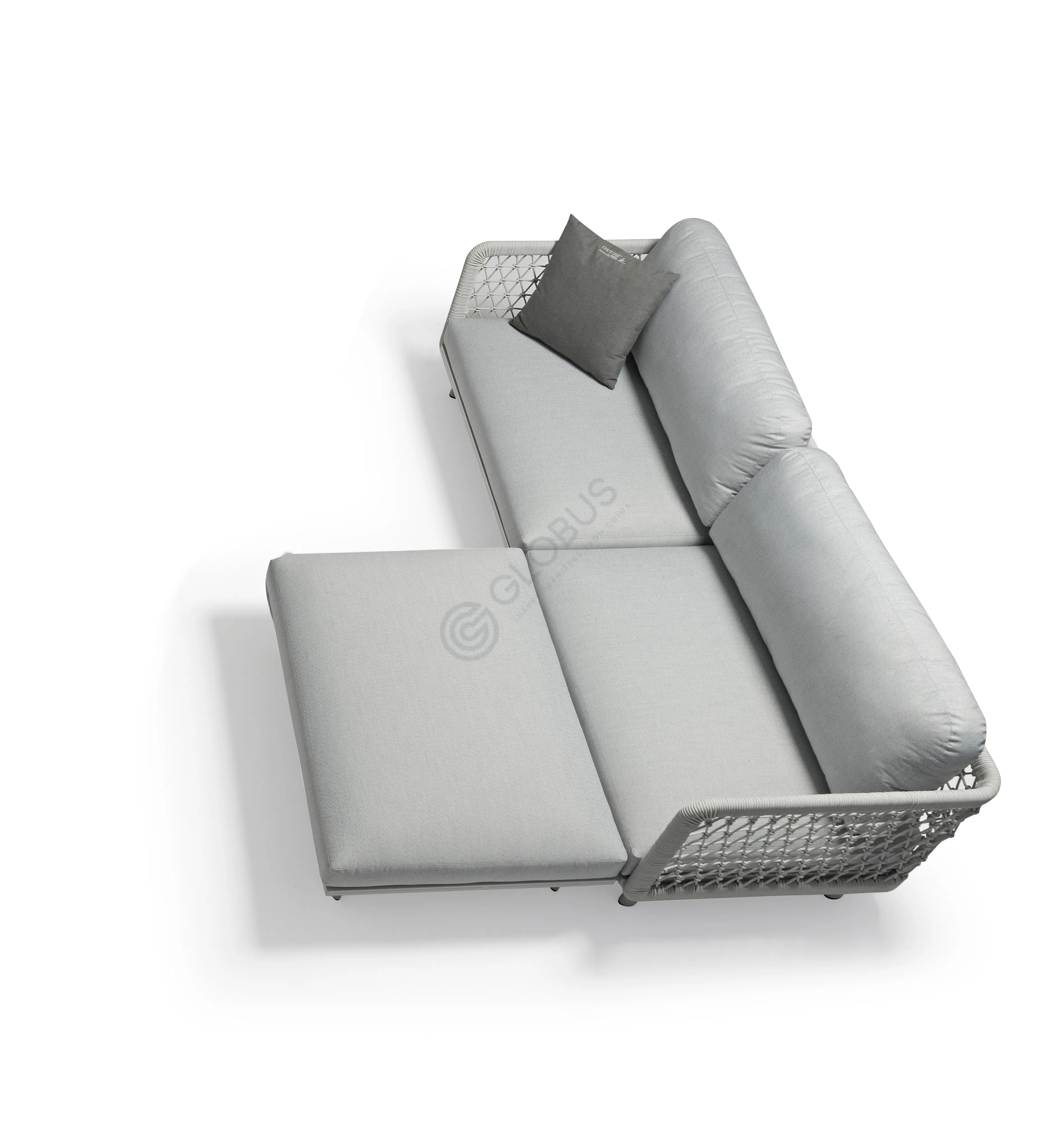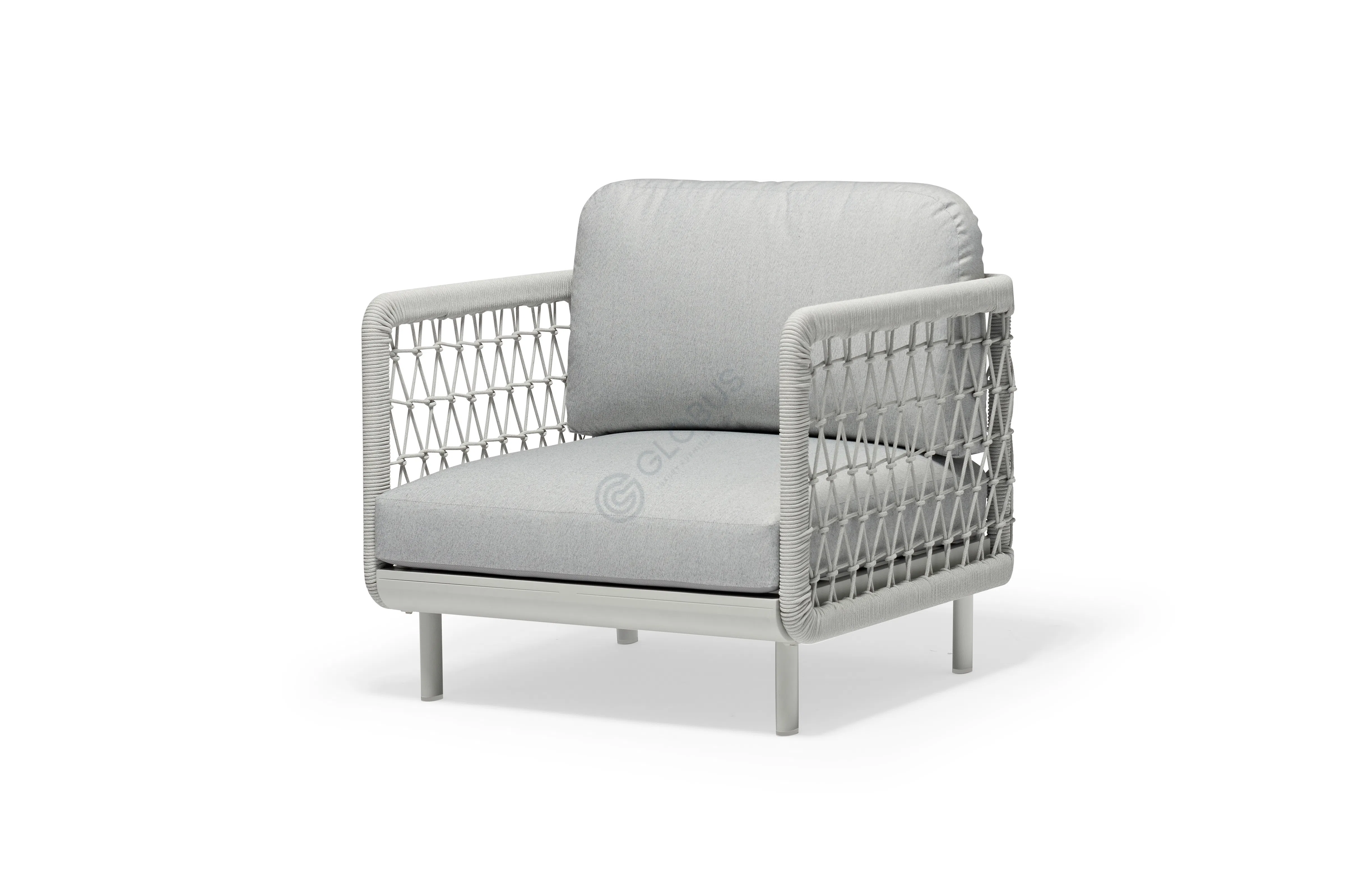 Надежность и долговечность обеспечивает прочный каркас из легкого алюминия. Боковые элементы украшает утонченное плетение из веревки, добавляя уникальный тактильный и визуальный акцент. Мягкость и комфорт достигаются за счет использования высококачественного текстиля для подушек сидений и спинки, устойчивого к внешним воздействиям.
