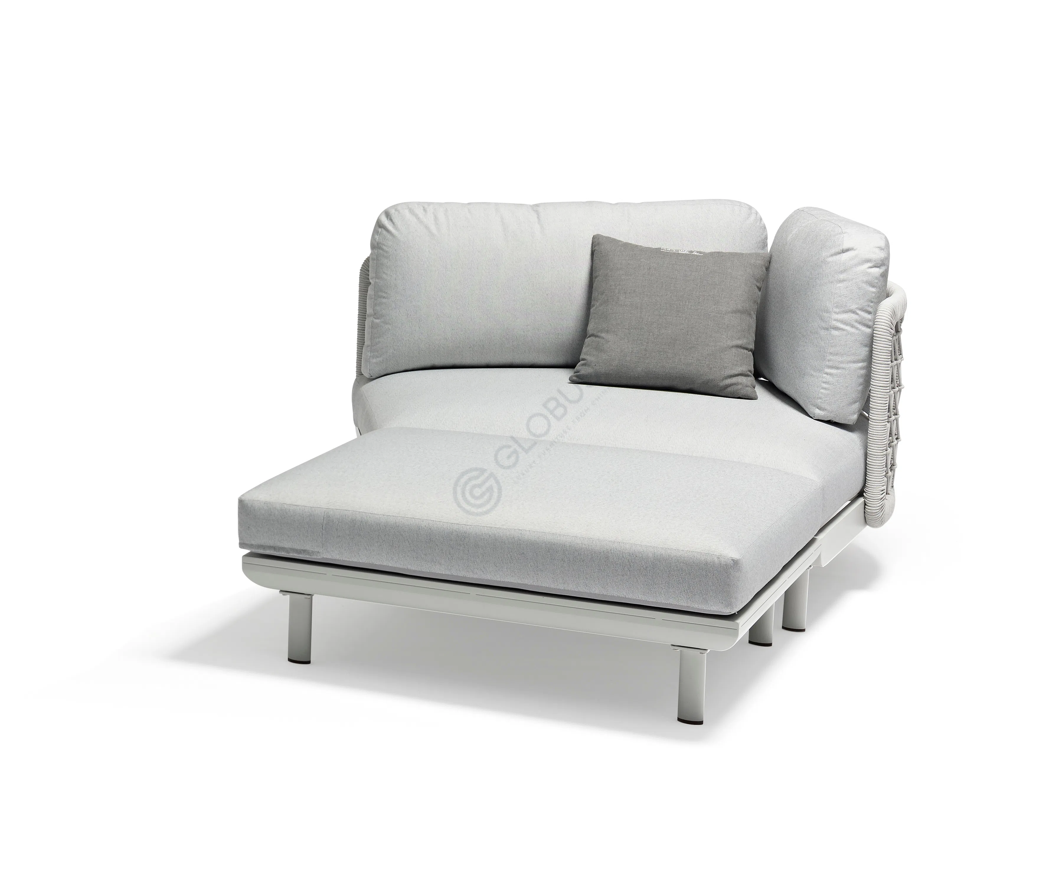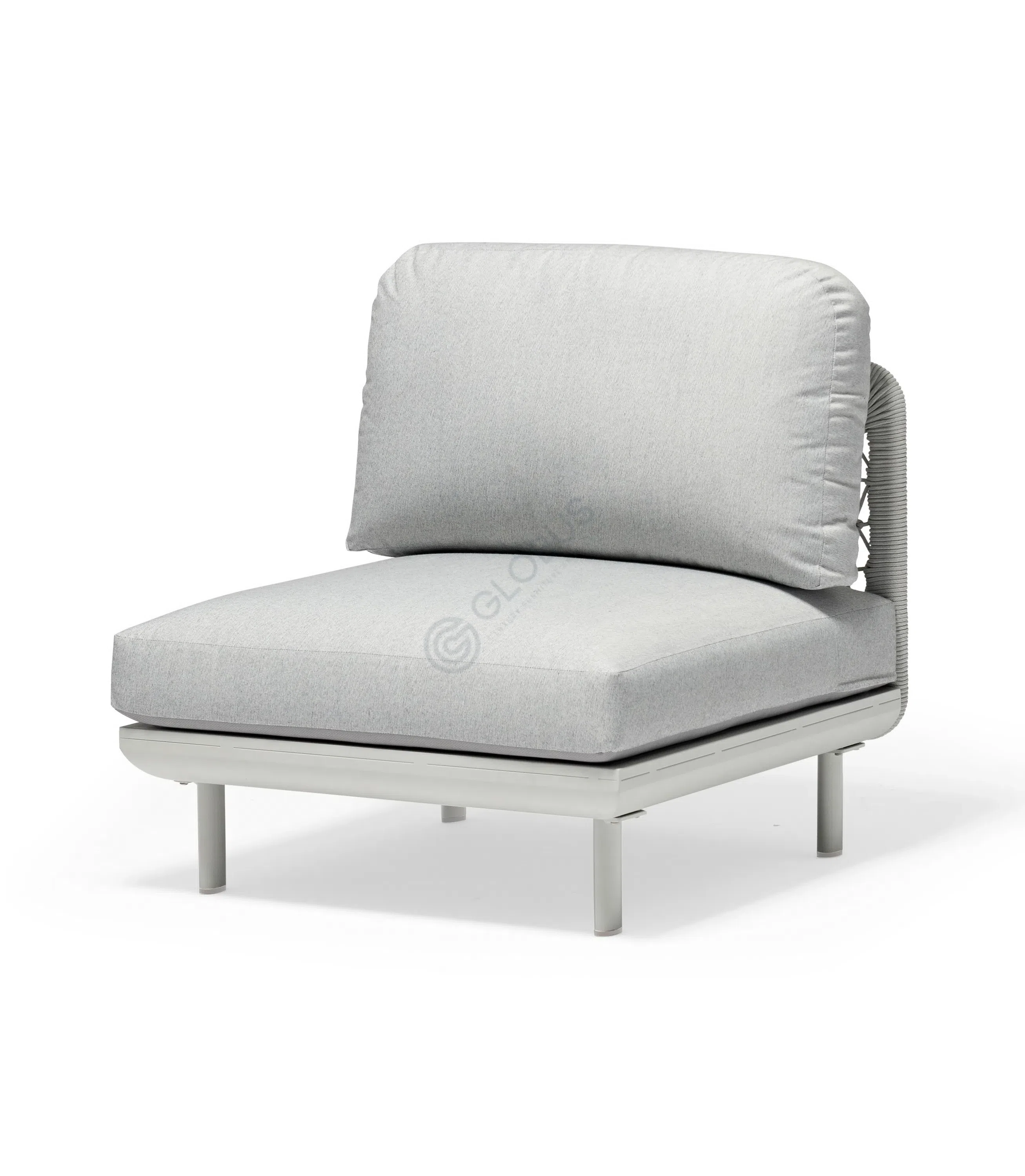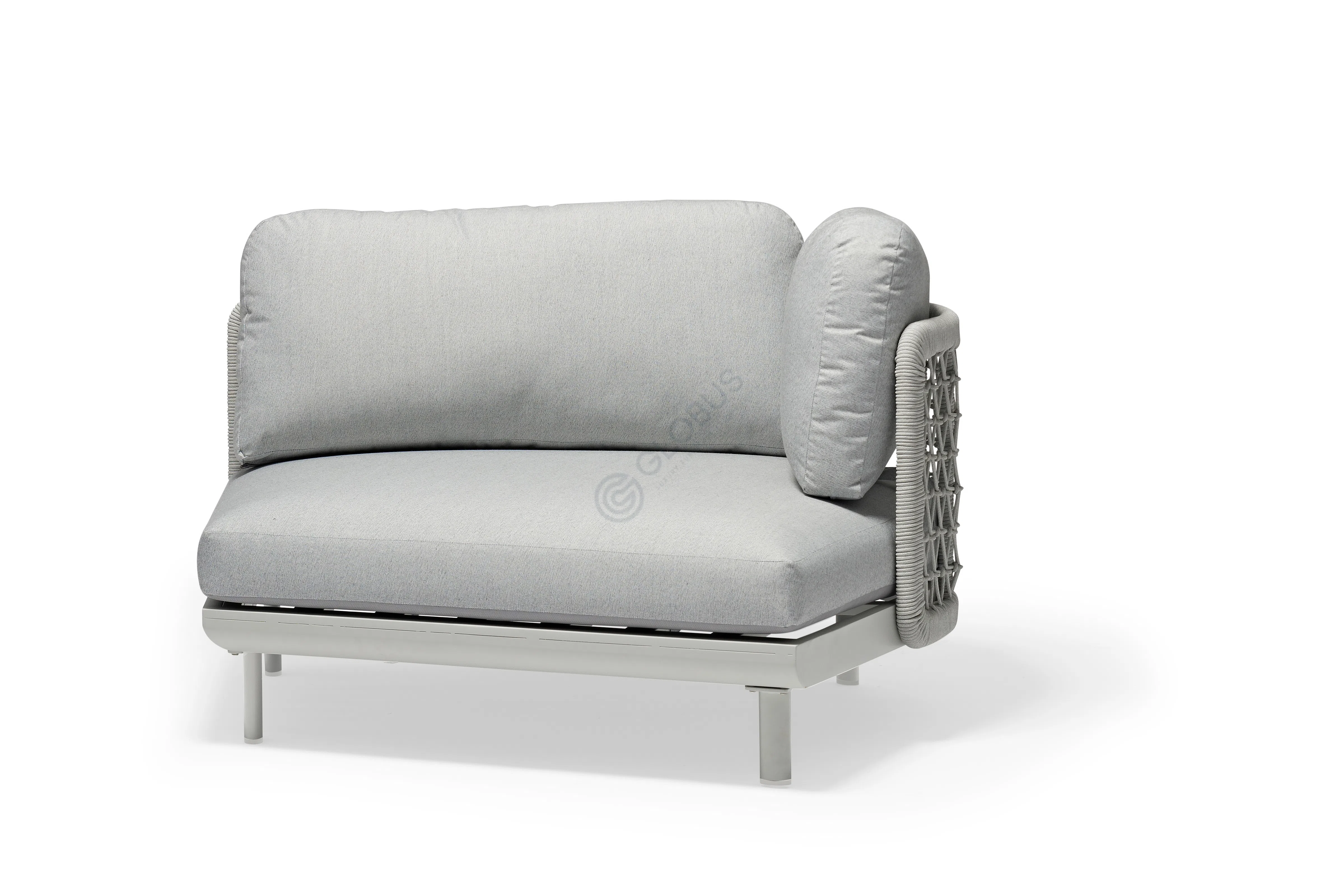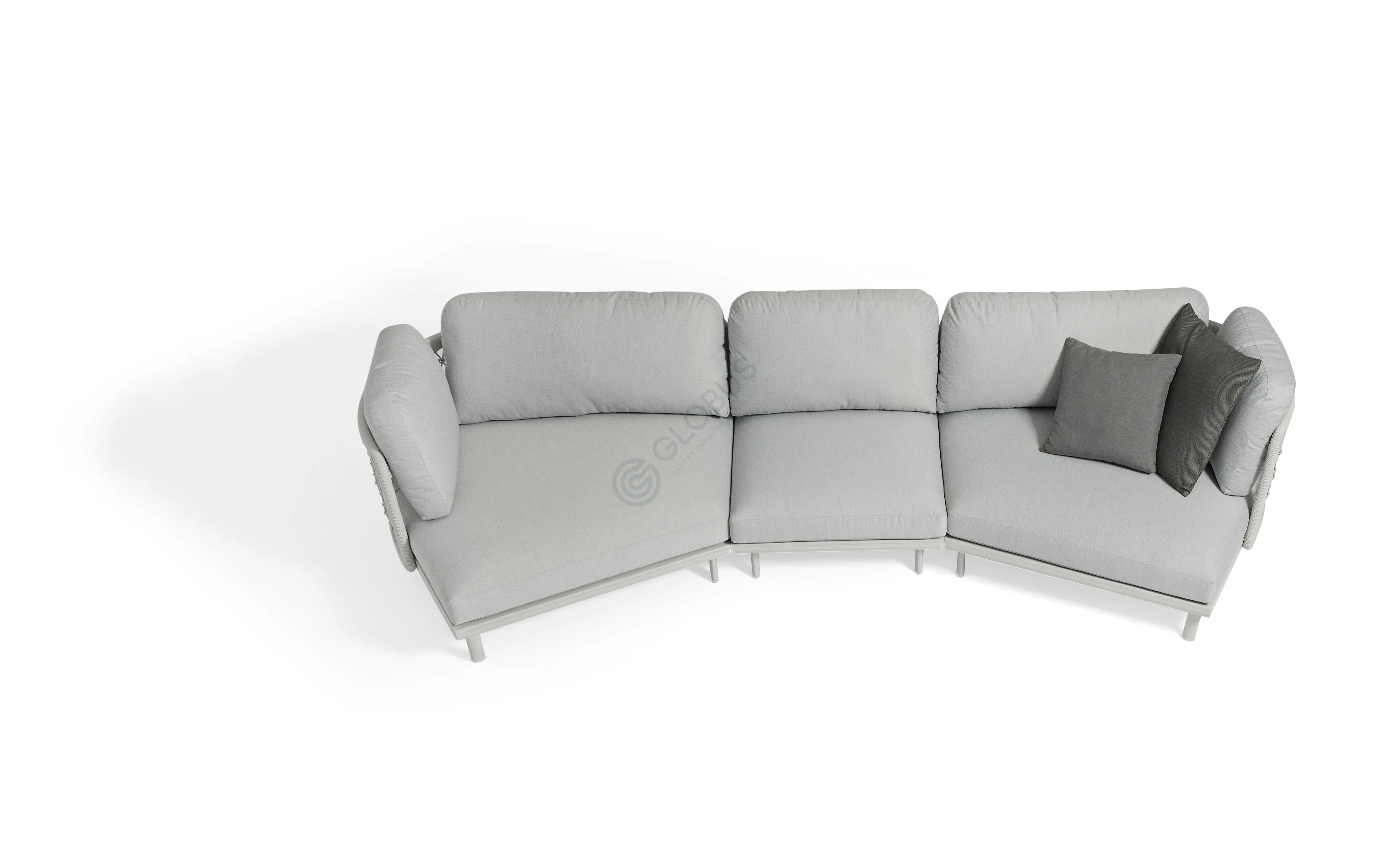 Надежность и долговечность обеспечивает прочный каркас из легкого алюминия. Боковые элементы украшает утонченное плетение из веревки, добавляя уникальный тактильный и визуальный акцент. Мягкость и комфорт достигаются за счет использования высококачественного текстиля для подушек сидений и спинки, устойчивого к внешним воздействиям.
