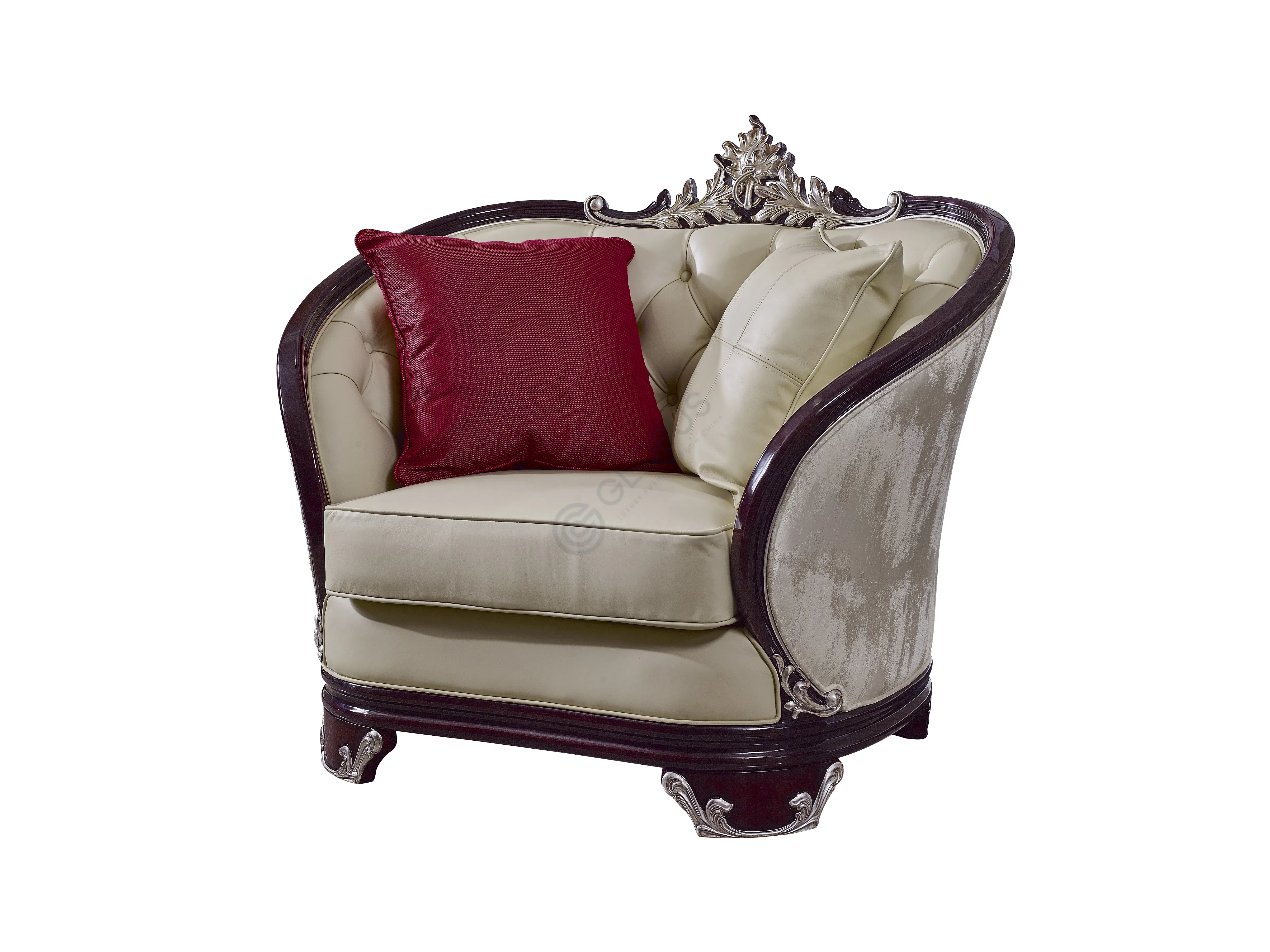 Каркас изделия выполнен из комбинации натурального дерева и прочной фанеры, что гарантирует долговечность и надежность конструкции. Изящные резные элементы и декоративные накладки подчеркивают принадлежность к классическому стилю. Обивка сочетает приятный на ощупь текстиль и практичную экокожу, предлагая комфорт и красоту. Подушки разных текстур и цветов добавляют выразительности.
