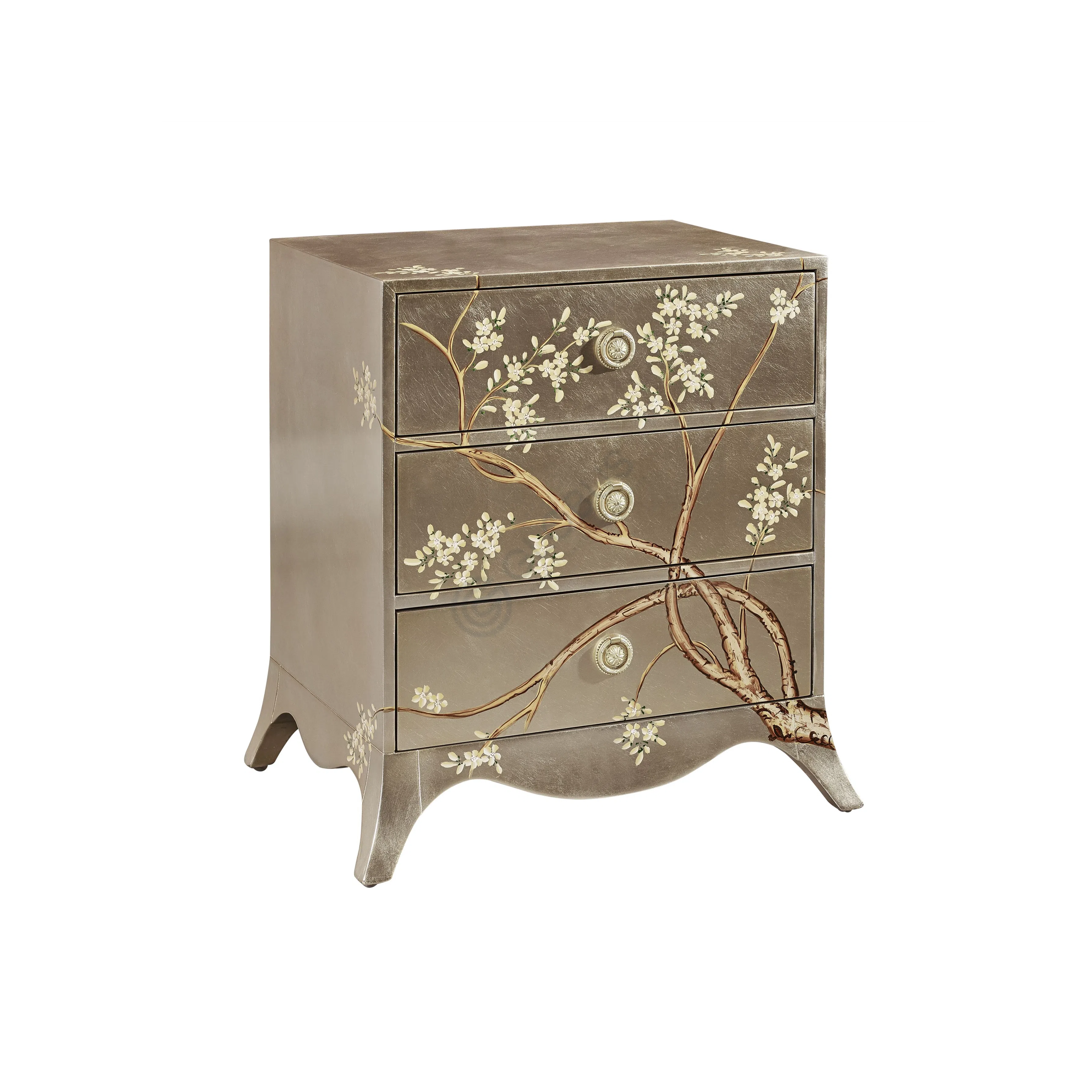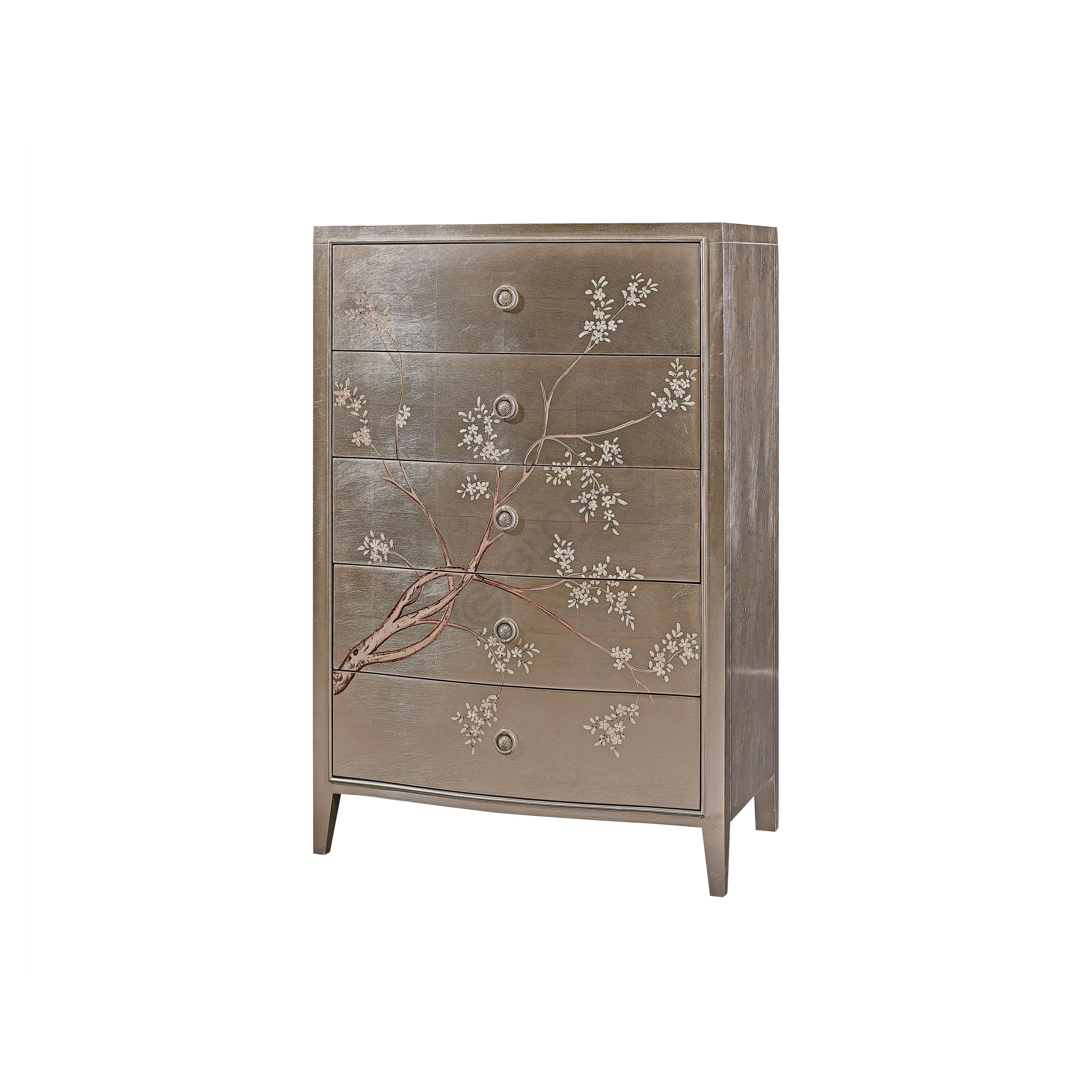Фасад украшен искусной росписью, изображающей цветочные композиции в вазах и корзинах, окруженные витиеватыми растительными узорами. Боковые части дополнены элементами, напоминающими стебли бамбука, что привносит легкий акцент. Каждая деталь декора выполнена с вниманием и мастерством, превращая буфет в настоящее произведение прикладного искусства. Фурнитура гармонично сочетается с общим стилем, завершая образ.