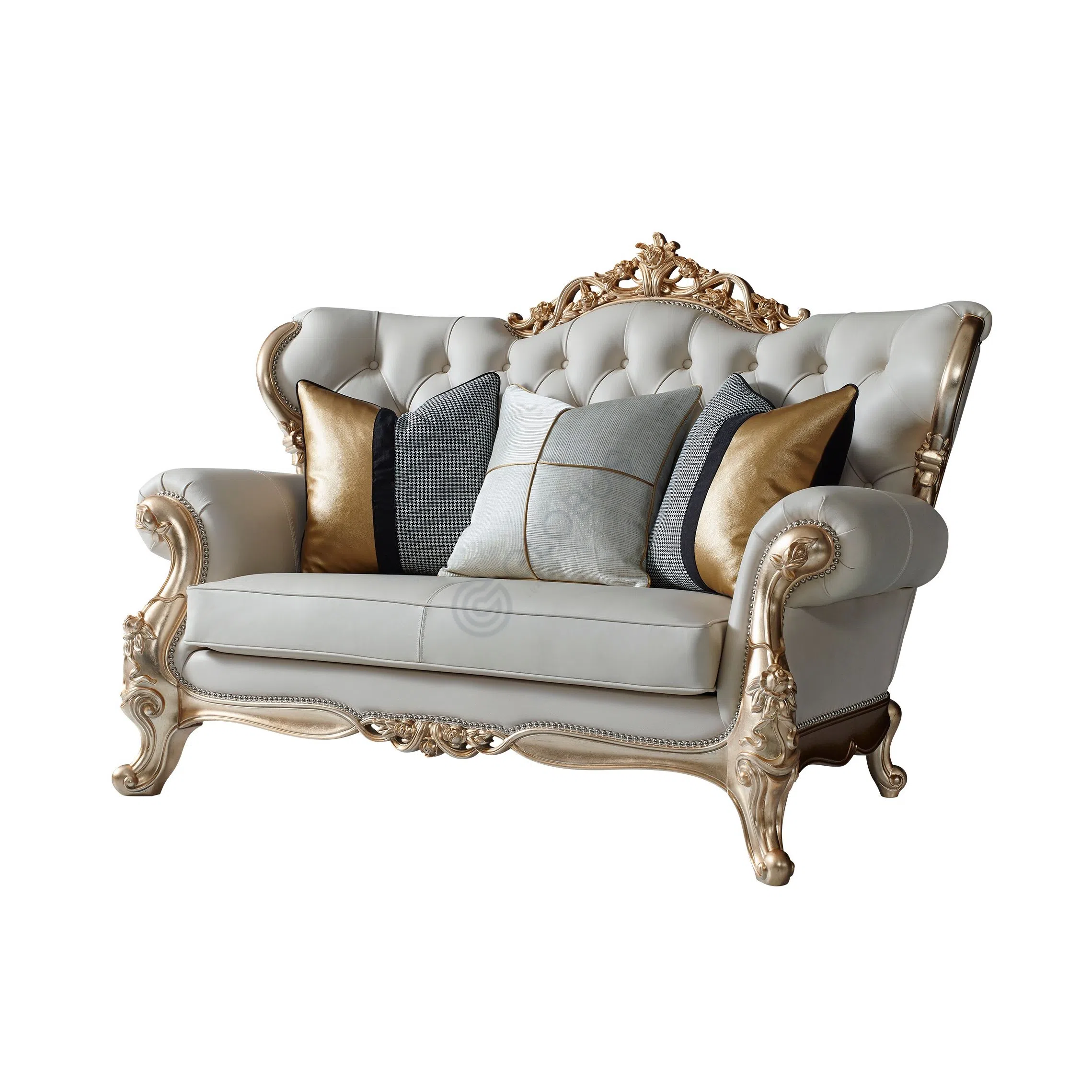 Каркас, созданный из массива натурального дерева и прочной фанеры, обеспечивает изделию надежность. Особое внимание привлекают резные элементы, покрытые патиной под золото, что придает им изысканный, слегка антикварный вид. Обивка выполнена из высококачественной кожи молочного оттенка, приятной на ощупь и долговечной.