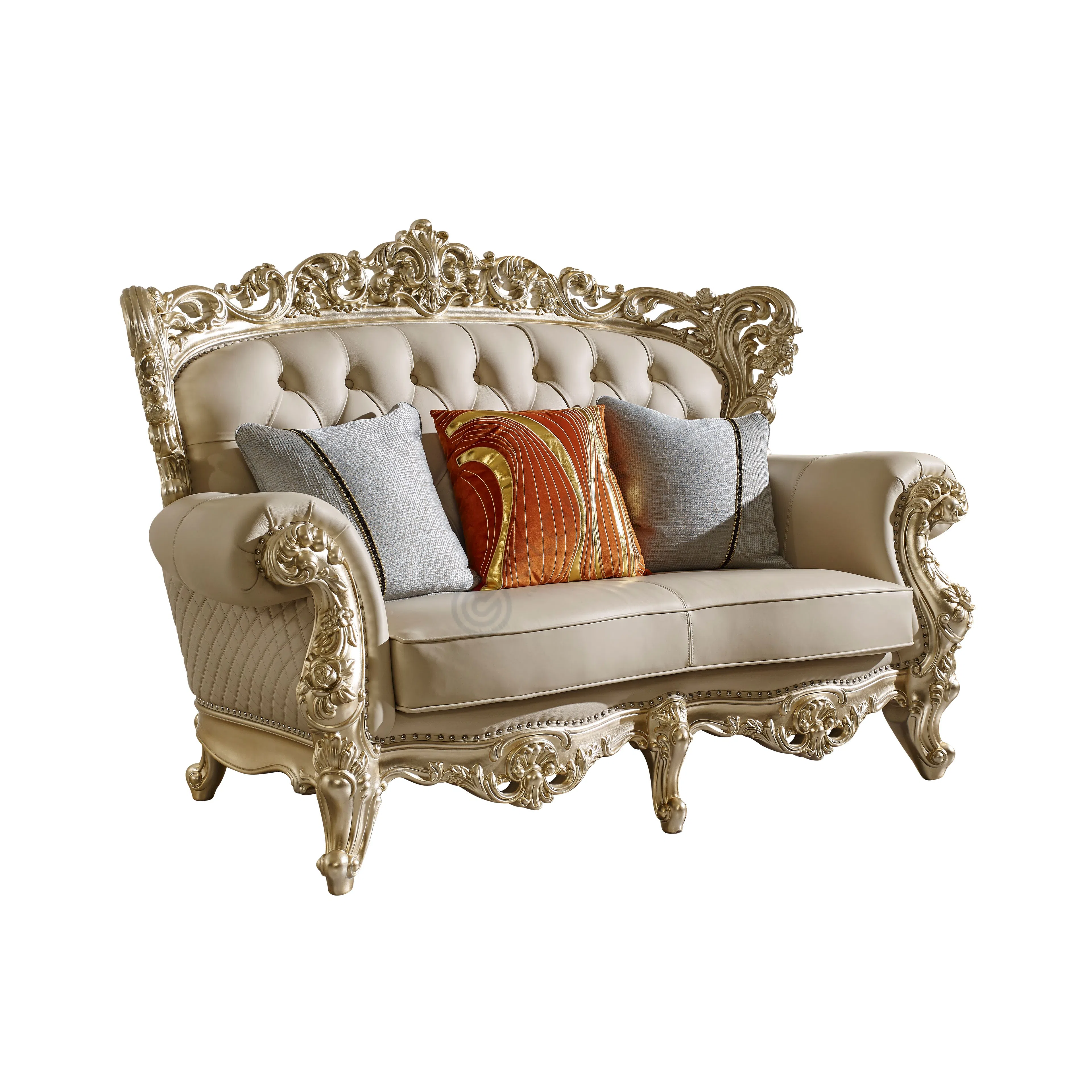Его изящный силуэт дополнен декоративной резьбой по натуральному дереву, покрытой благородной патиной, которая придает изделию особый винтажный вид. Спинка украшена глубокой каретной стяжкой, создающей объем и подчеркивающей роскошь обивки. Плавные линии подлокотников и резные ножки завершают образ, добавляя визуальной легкости.