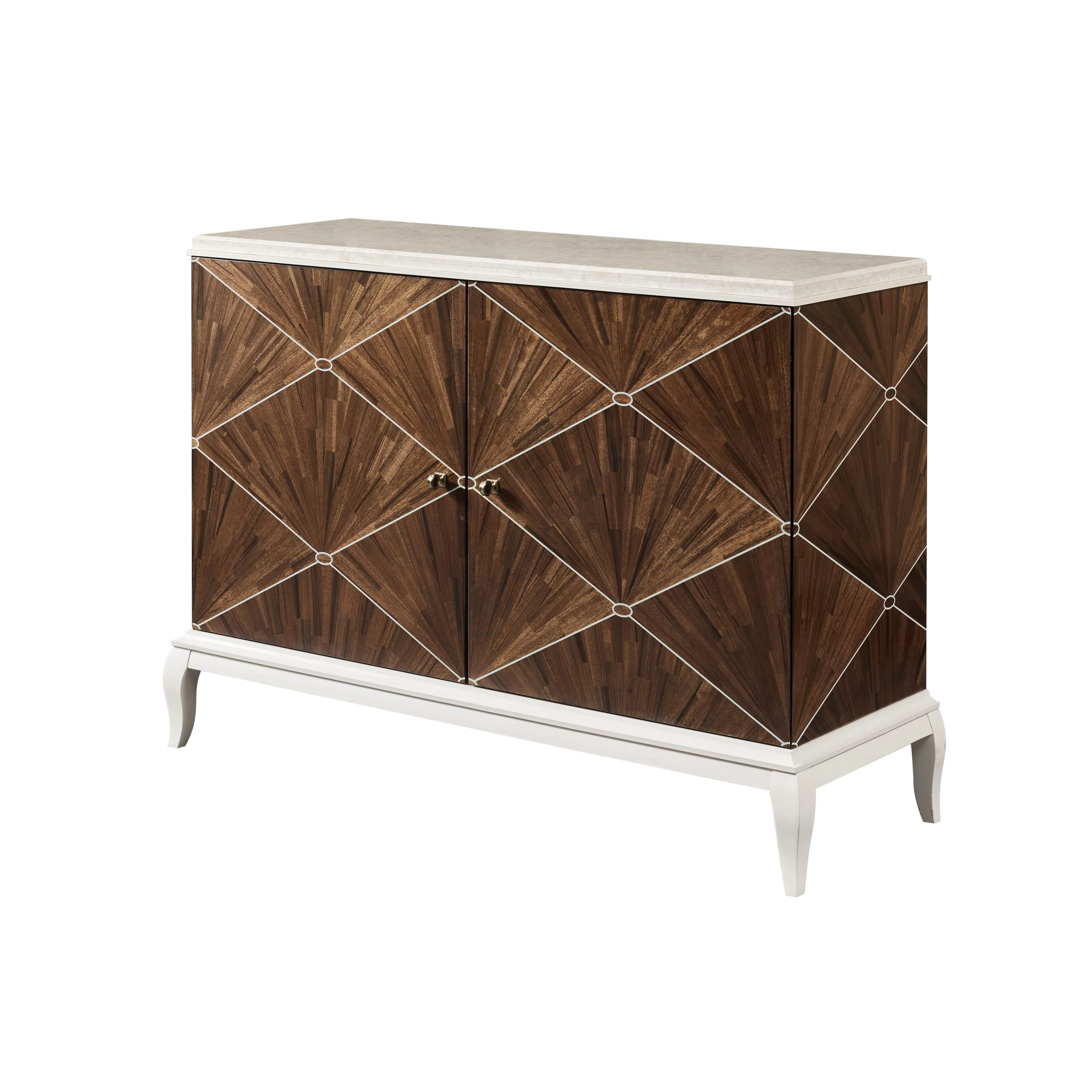 Этот журнальный столик представляет собой воплощение элегантности и утонченного стиля неоклассики. Его дизайн притягивает взгляд благодаря гармоничному сочетанию форм и отделки. Светлая, гладкая поверхность столешницы изящно контрастирует с боковыми панелями, украшенными восхитительным геометрическим рисунком из шпона. Этот узор создает ощущение глубины и придает предмету особый, роскошный вид.