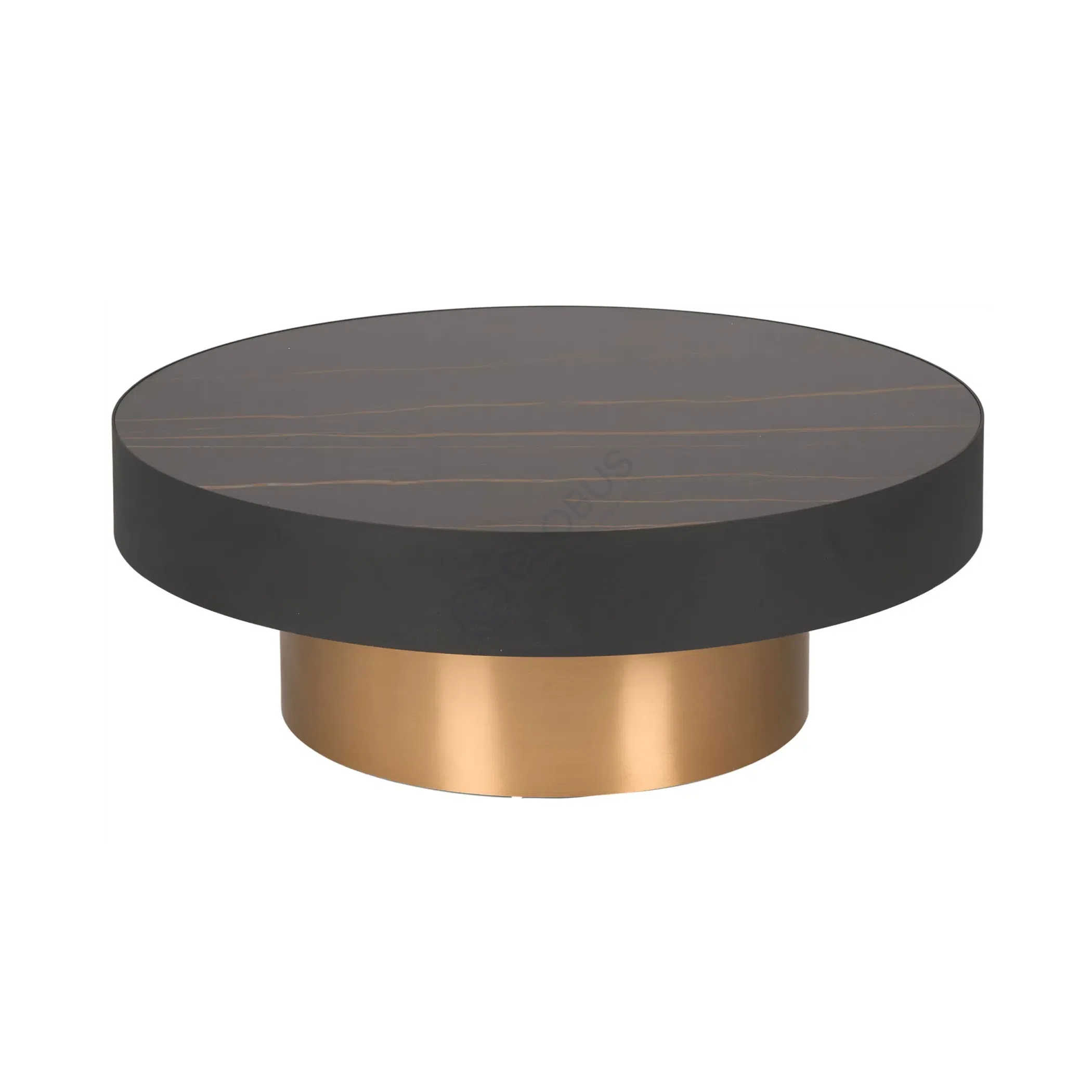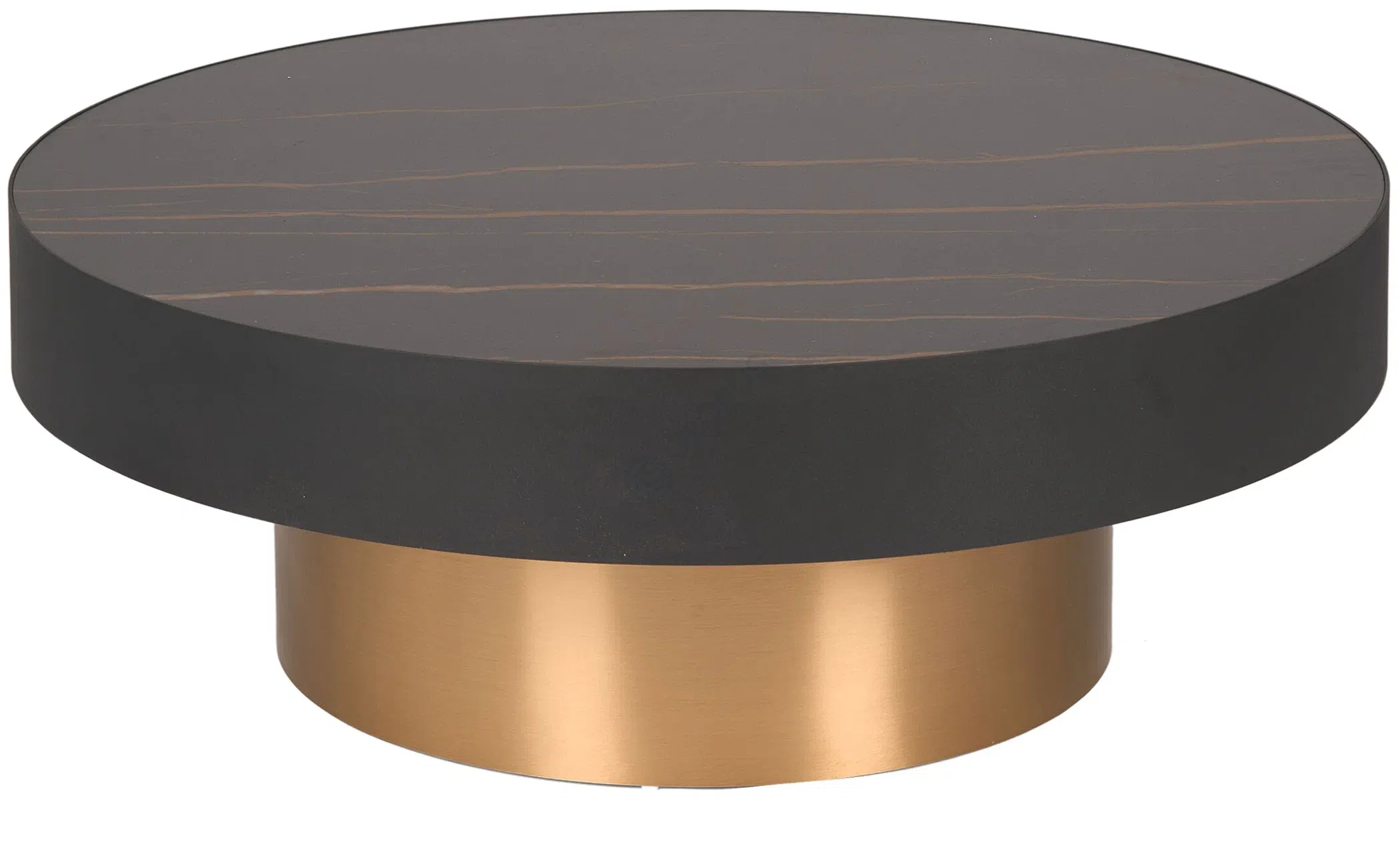 Верхняя часть выполнена из спеченного камня, материала, ценящегося за свою прочность и долговечность, а также за уникальную природную текстуру. Темный оттенок столешницы с едва заметным узором придает глубину и ощущение основательности. Опора изготовлена из высококачественной нержавеющей стали с благородным золотистым покрытием, создавая эффектный контраст и добавляя изделию сияния.