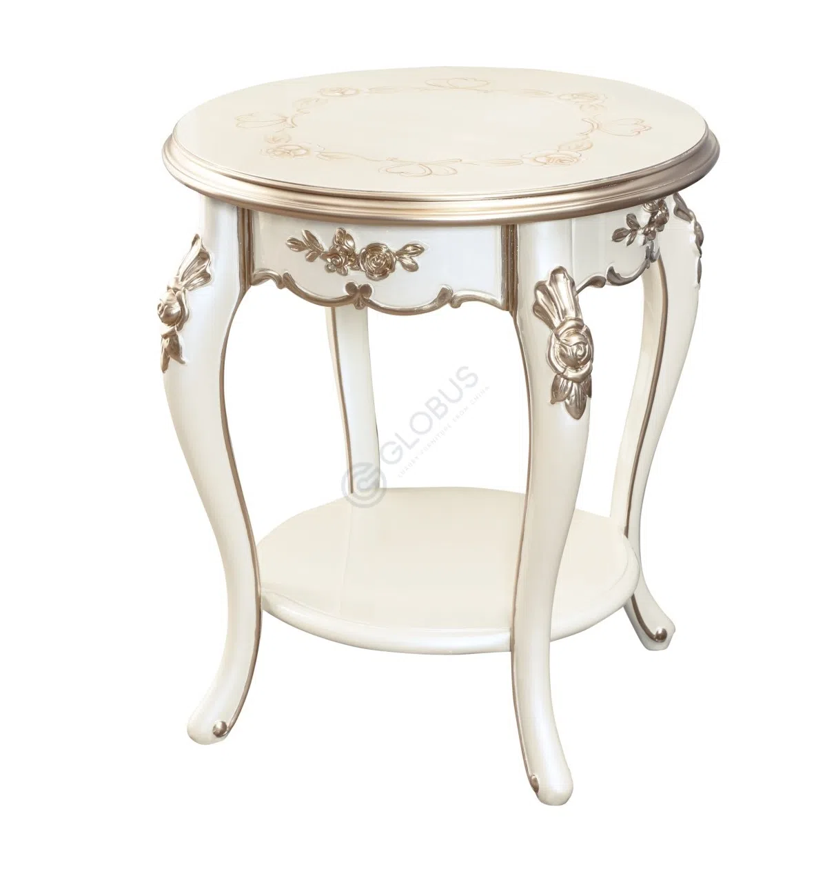 Изделие выполнено из натурального дерева и фанеры, что обеспечивает его долговечность и стабильность. Поверхность украшена тонкой орнаментальной резьбой, подчеркивающей изящество изогнутых ножек и фигурного основания. Деликатная отделка придает столику благородный вид.