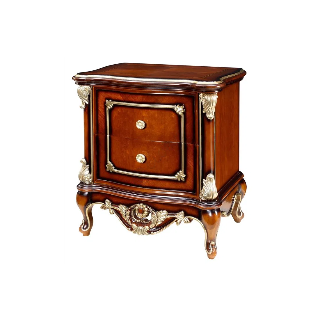 Декоративные детали представлены сложной резьбой и утонченной фурнитурой. Золотистая патина, деликатно подчеркивающая каждый завиток орнамента и контуры фасада, создает ощущение роскоши и ручной работы. Этот столик является не просто функциональным дополнением, но и ярким акцентом, способным преобразить интерьер.