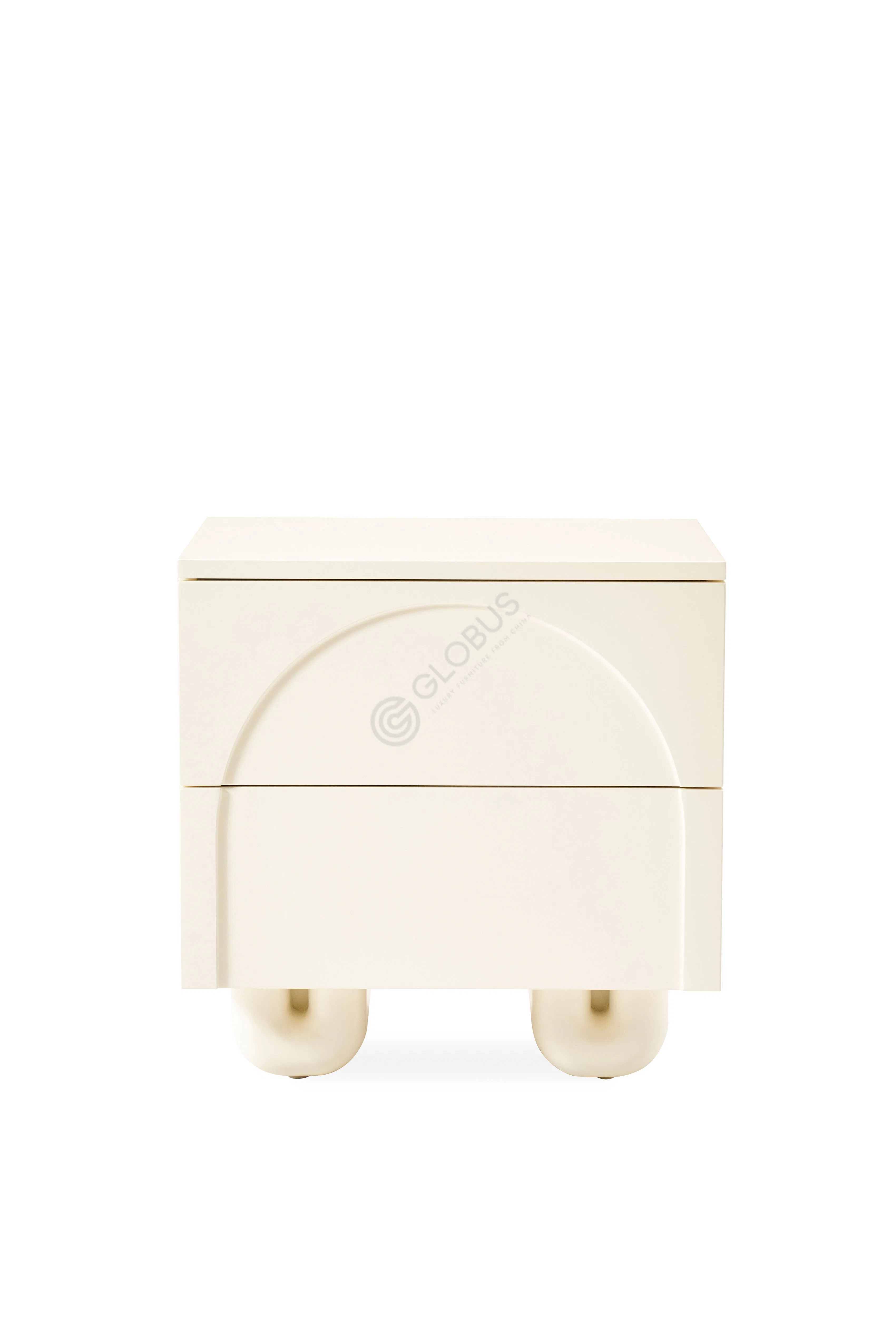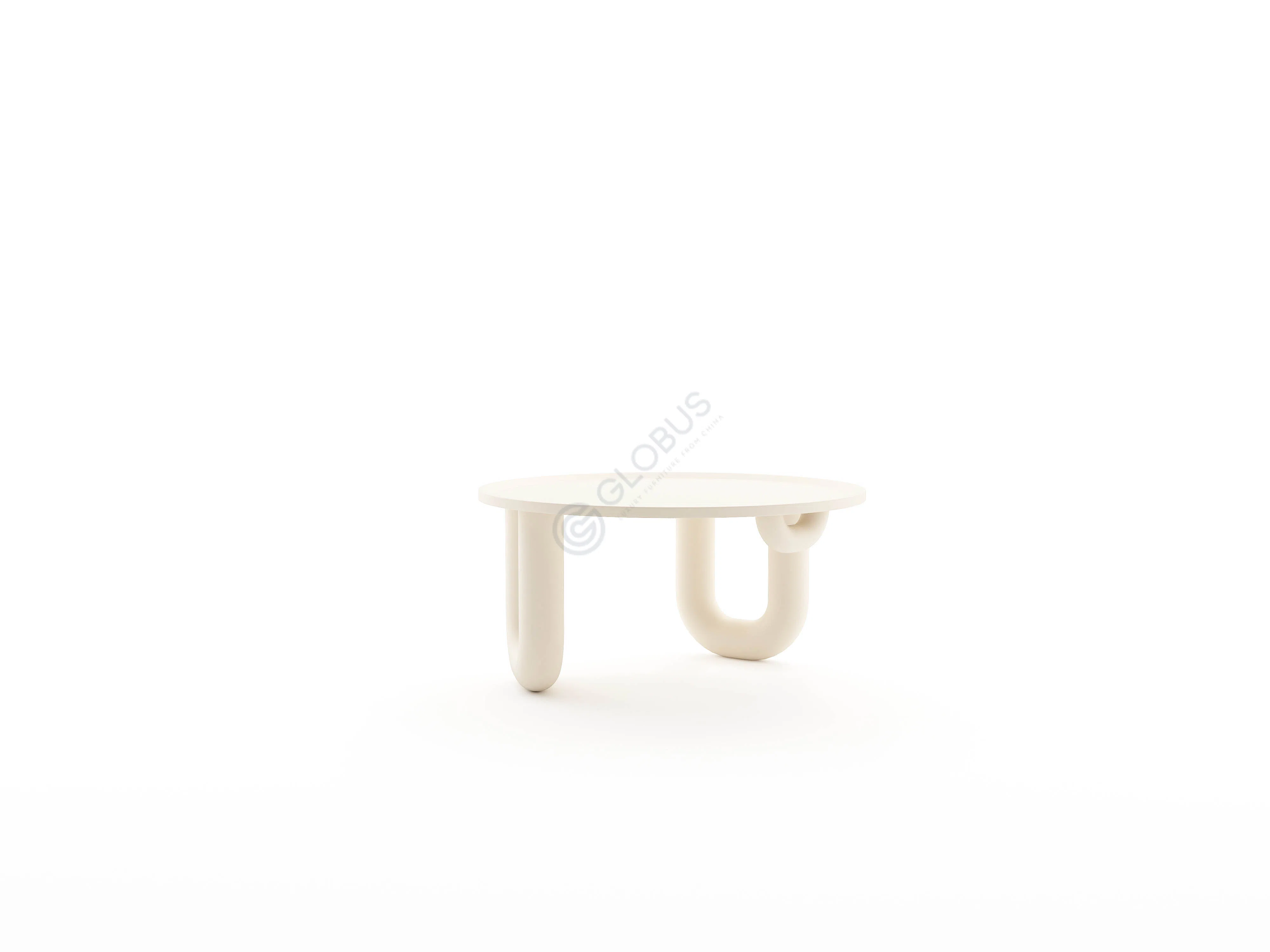 Круглая столешница органично сочетается с утолщенными изогнутыми ножками, которые создают визуальную стабильность и придают изделию скульптурный характер. Молочный оттенок поверхности добавляет утонченности и мягкости в оформление пространства.